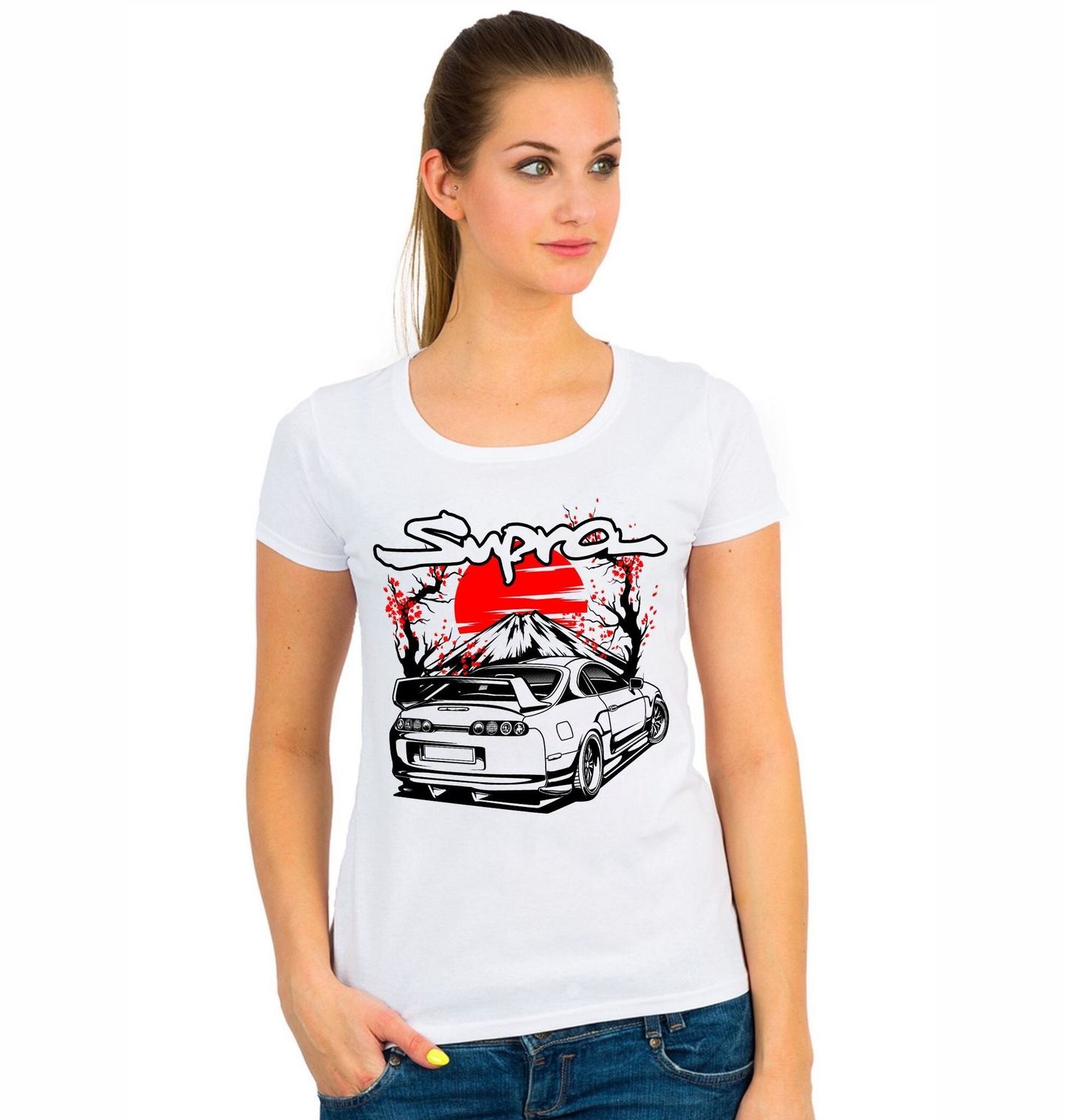 Dámské tričko Supra pod Horou Fudži. Originální motiv spojuje legendární japonské auto s ikonickou krajinou Japonska, kde v pozadí vyniká hora Fuji a tradiční sakury. Detailní kresba zachycuje agresivní zadní část a sportovní siluetu, která je typická pro tuningovou scénu JDM. Inspirací je slavná Toyota Supra MK4 – vůz známý svým výkonem, možnostmi úprav a nadčasovým designem.