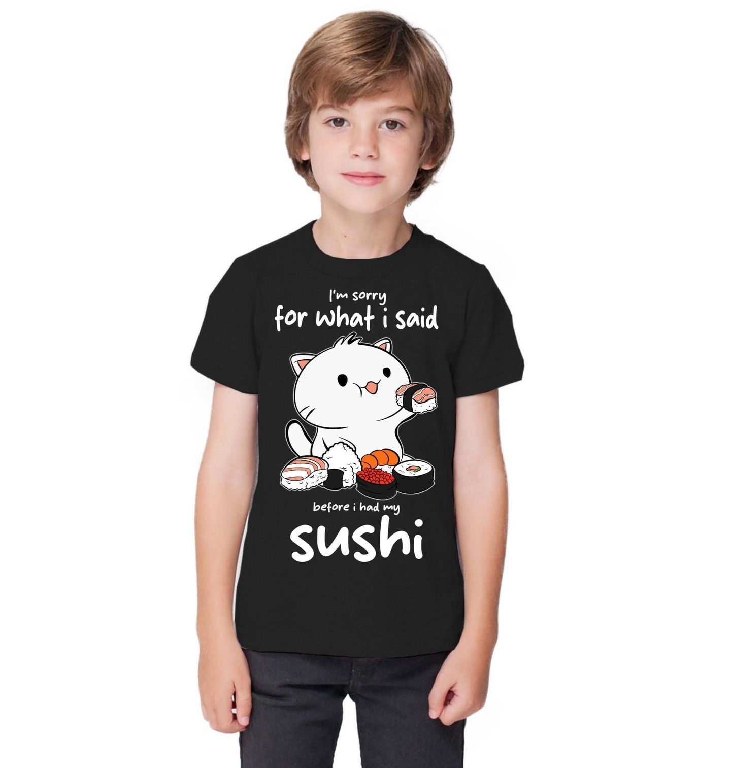 Dětské tričko Sushi Kočka. Roztomilá ilustrace ukazuje kočku, která si užívá sushi, doplněná vtipným textem „I’m sorry for what I said before I had my sushi“, což znamená „Omlouvám se za to, co jsem řekl, než jsem měl sushi“. Ideální motiv pro milovníky jídla, humoru a koček.
