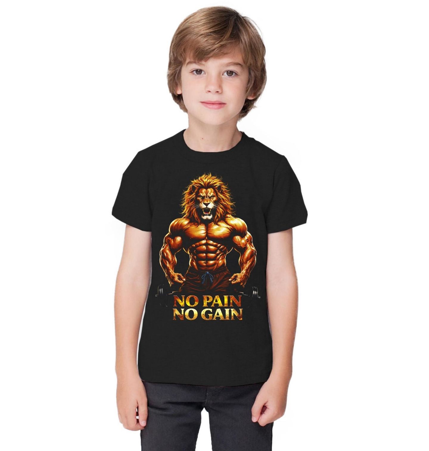 Dětské tričko Svalnatý Lev No Pain No Gain. Lev jako král zvířat zde představuje vůli, odhodlání a mentalitu vítěze. Spojení s gym prostředím a posilování vytváří silný motivační vizuál, který tě nakopne při každém tréninku. Pokud věříš, že bez dřiny není výsledků, tenhle motiv je přesně pro tebe. “No pain no gain” = „Bez dřiny nejsou výsledky“. Perfektní volba pro sportovce, fitness nadšence i každého, kdo chce ukázat svou sílu a mindset bez výmluv.