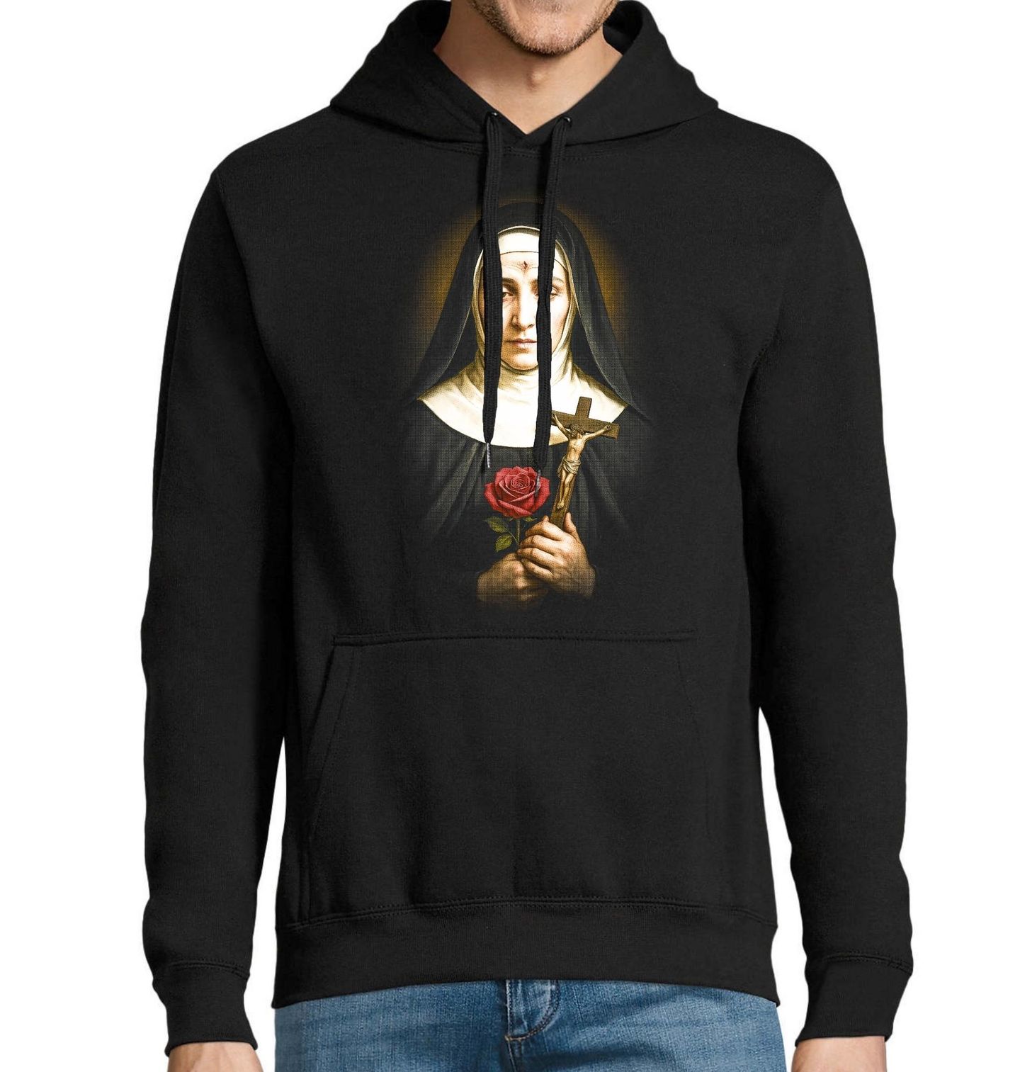 Pánská mikina Svatá Rita z Cascie. Svatá Rita z Cascie je jednou z nejuctívanějších postav křesťanství. Na čele se jí objevila rána, připomínající rány z Ježíšovy trnové koruny. Je patronkou v beznadějných situacích. Je tradičně zobrazována s křížem a růží, které symbolizují její oddanost Kristu.