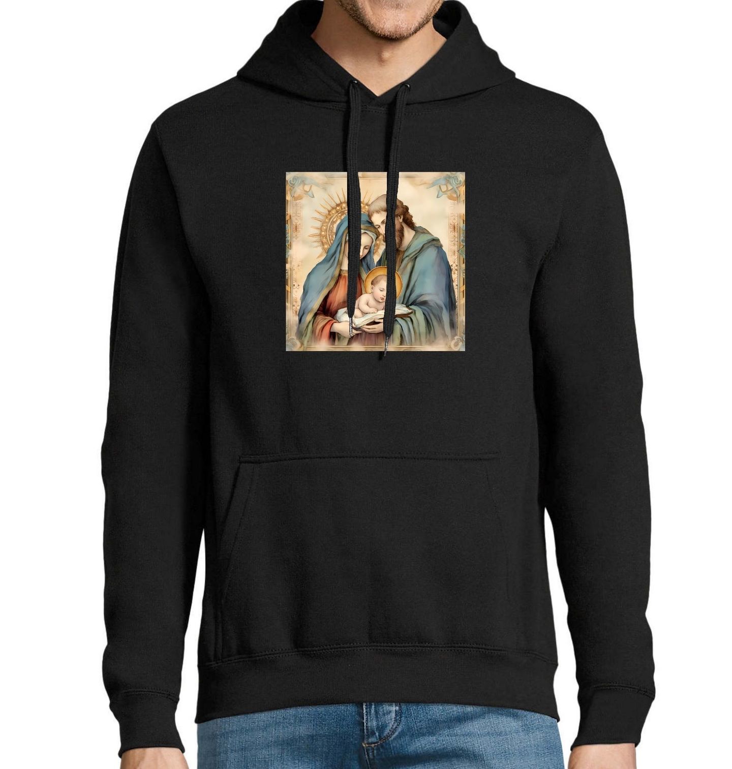 Pánská mikina Svatá rodina Ježíš Kristus, Marie a Josef. Tričko s motivem svaté rodiny představuje ikonické zobrazení Ježíše Krista jako novorozeného dítěte, jemně spočívajícího v náručí Panny Marie a svatého Josefa. Tento detailní a umělecky laděný motiv evokuje hluboké hodnoty jako je víra, láska, rodina a samotné jádro křesťanství.