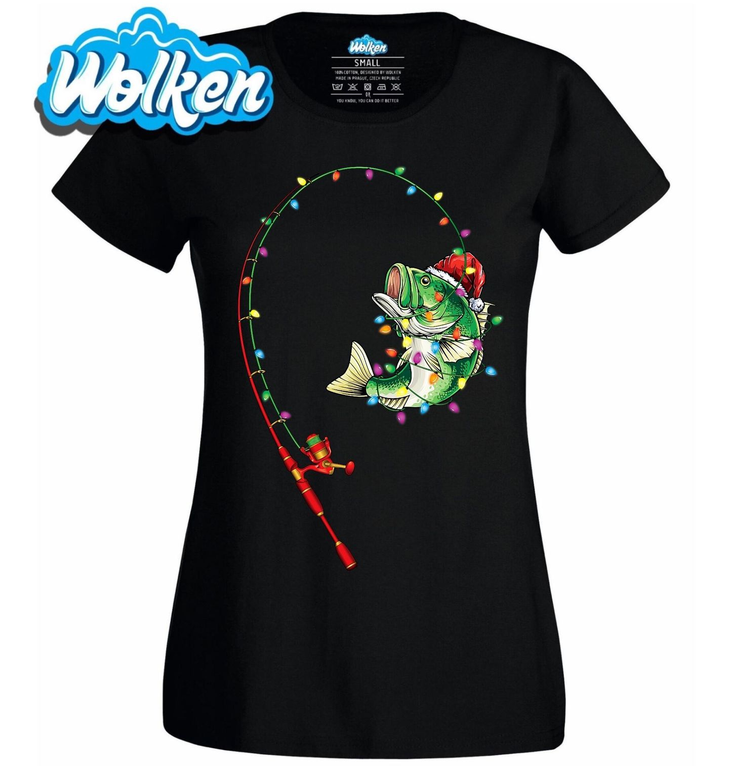 Dámské tričko Sváteční Úlovek. Vánoce jsou tady a s nimi i ten nejkrásnější úlovek! Tento originální motiv zachycuje rybu Largemouth Bass (Okounek pstruhový), která je oblíbenou trofejí každého vášnivého rybáře. Ryba je vyzdobená barevnými světýlky a čepicí Santa Clause, zatímco se hrdě houpe na prutu.