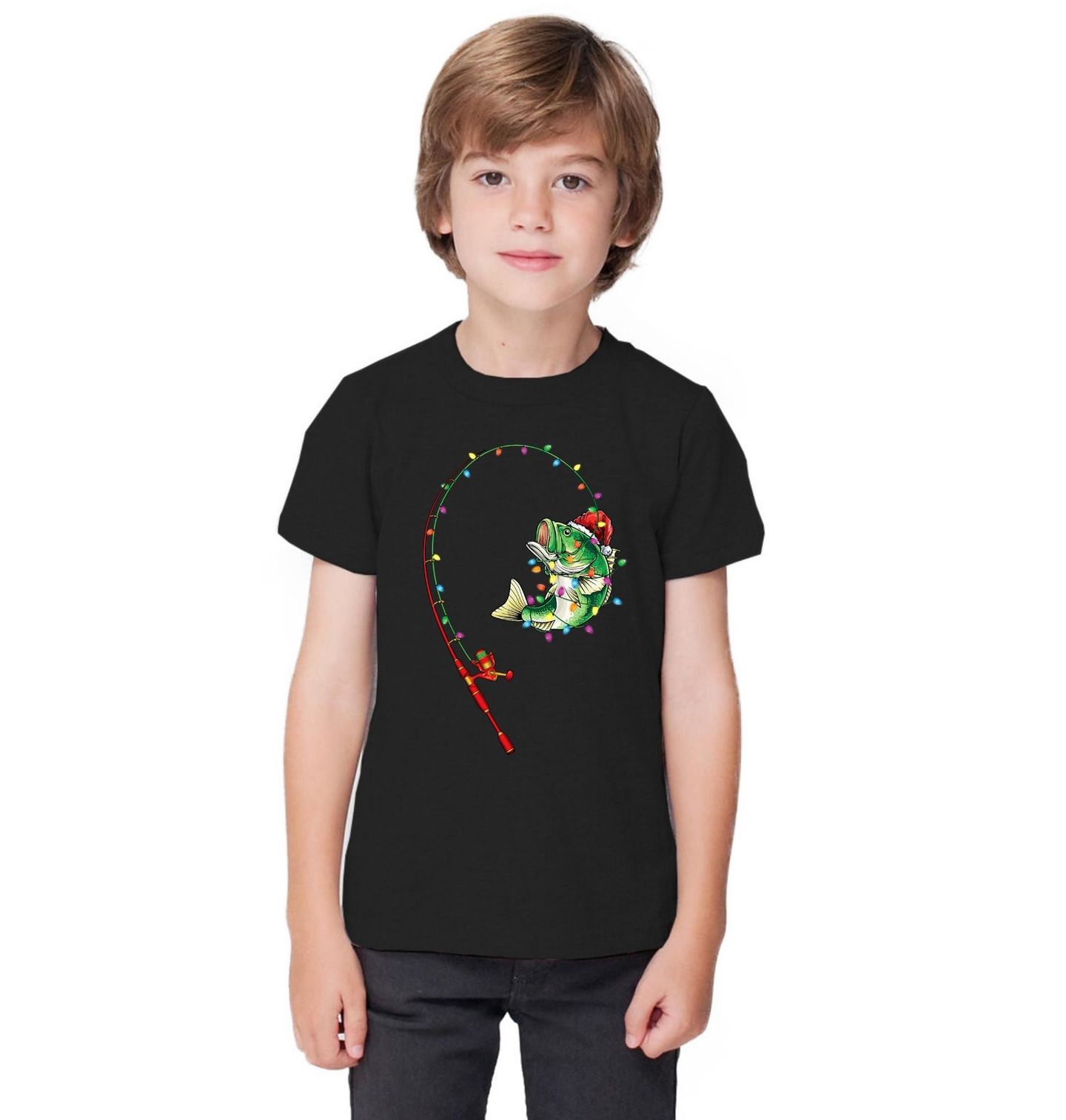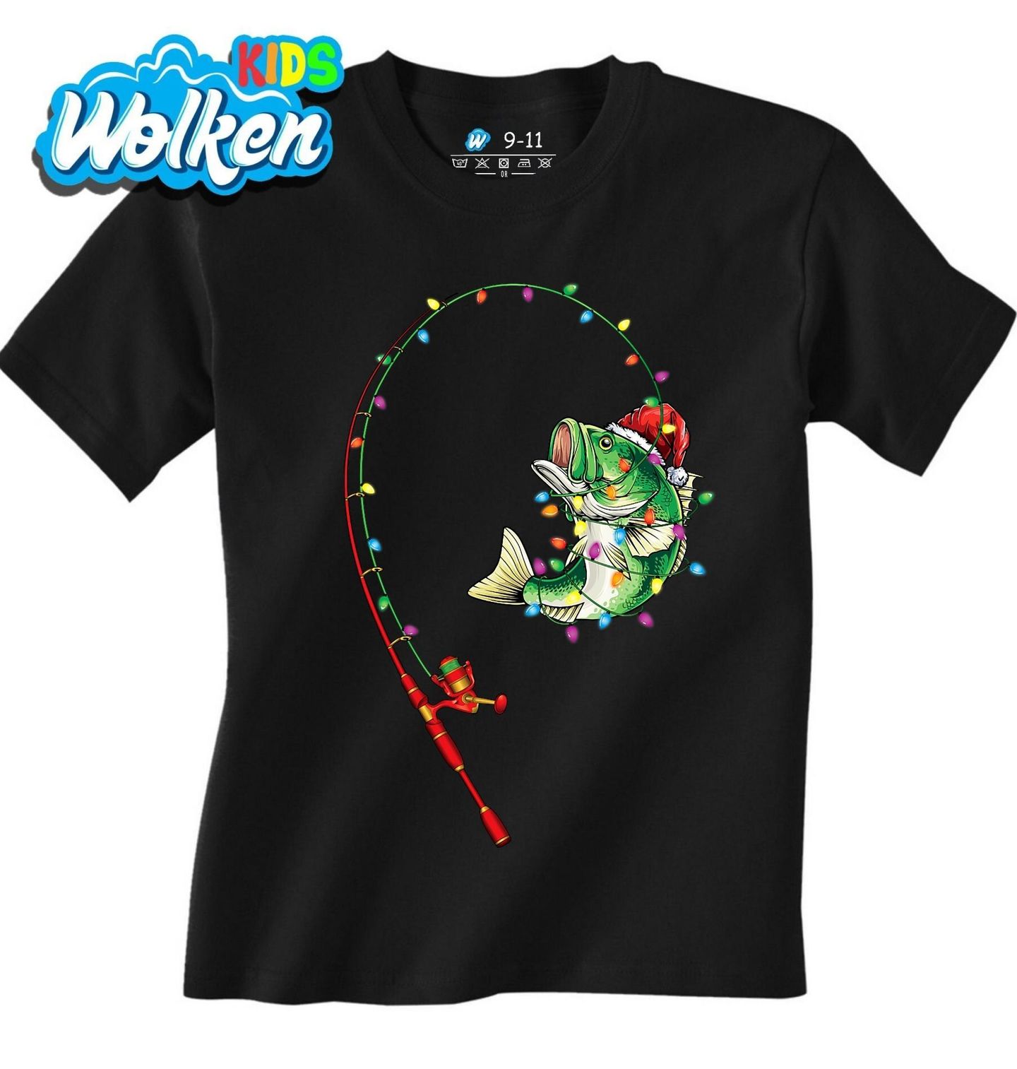 Dětské tričko Sváteční Úlovek. Vánoce jsou tady a s nimi i ten nejkrásnější úlovek! Tento originální motiv zachycuje rybu Largemouth Bass (Okounek pstruhový), která je oblíbenou trofejí každého vášnivého rybáře. Ryba je vyzdobená barevnými světýlky a čepicí Santa Clause, zatímco se hrdě houpe na prutu.