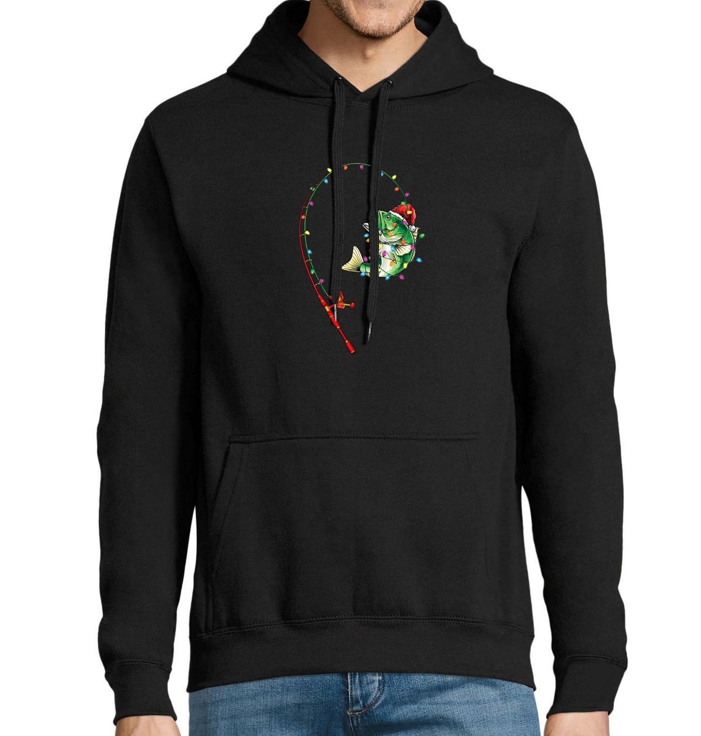 Pánská mikina Sváteční Úlovek. Vánoce jsou tady a s nimi i ten nejkrásnější úlovek! Tento originální motiv zachycuje rybu Largemouth Bass (Okounek pstruhový), která je oblíbenou trofejí každého vášnivého rybáře. Ryba je vyzdobená barevnými světýlky a čepicí Santa Clause, zatímco se hrdě houpe na prutu.