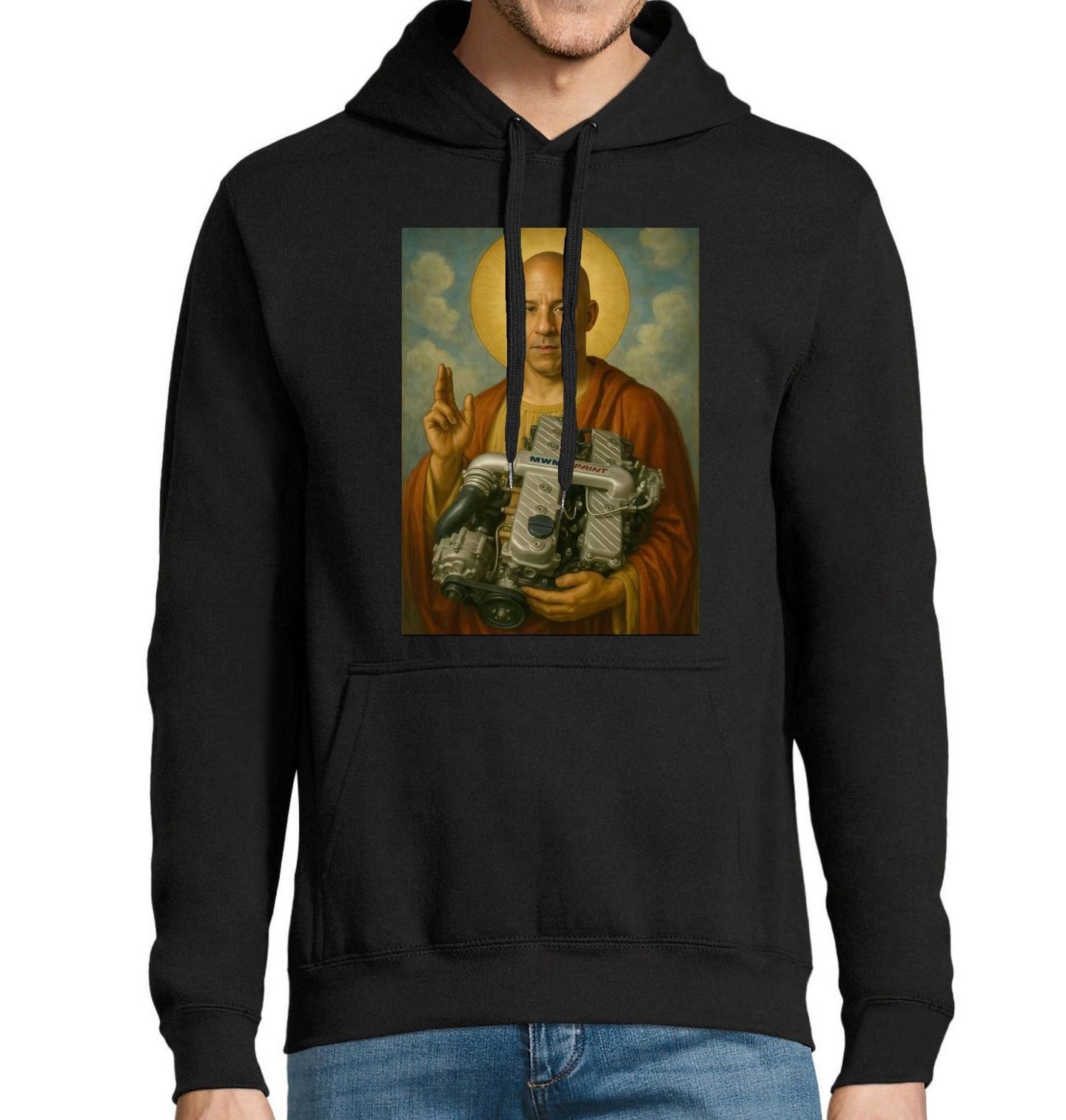 Pánská mikina Svatý Dom Toretto Ježíš Motorů MWM Sprint. Vtipná parodie, kde je zobrazen jako Ježíš Dominic Toretto (Dom), hlavní hrdina slavné série filmu Rychle a zběsile, známý svou láskou k rodině a rychlým autům. V rukou drží motor označený jako MWM Sprint, což je reálný spalovací motor používaný například v užitkových vozech. Celý motiv působí jako pocta automobilové kultuře s humorným nádechem.