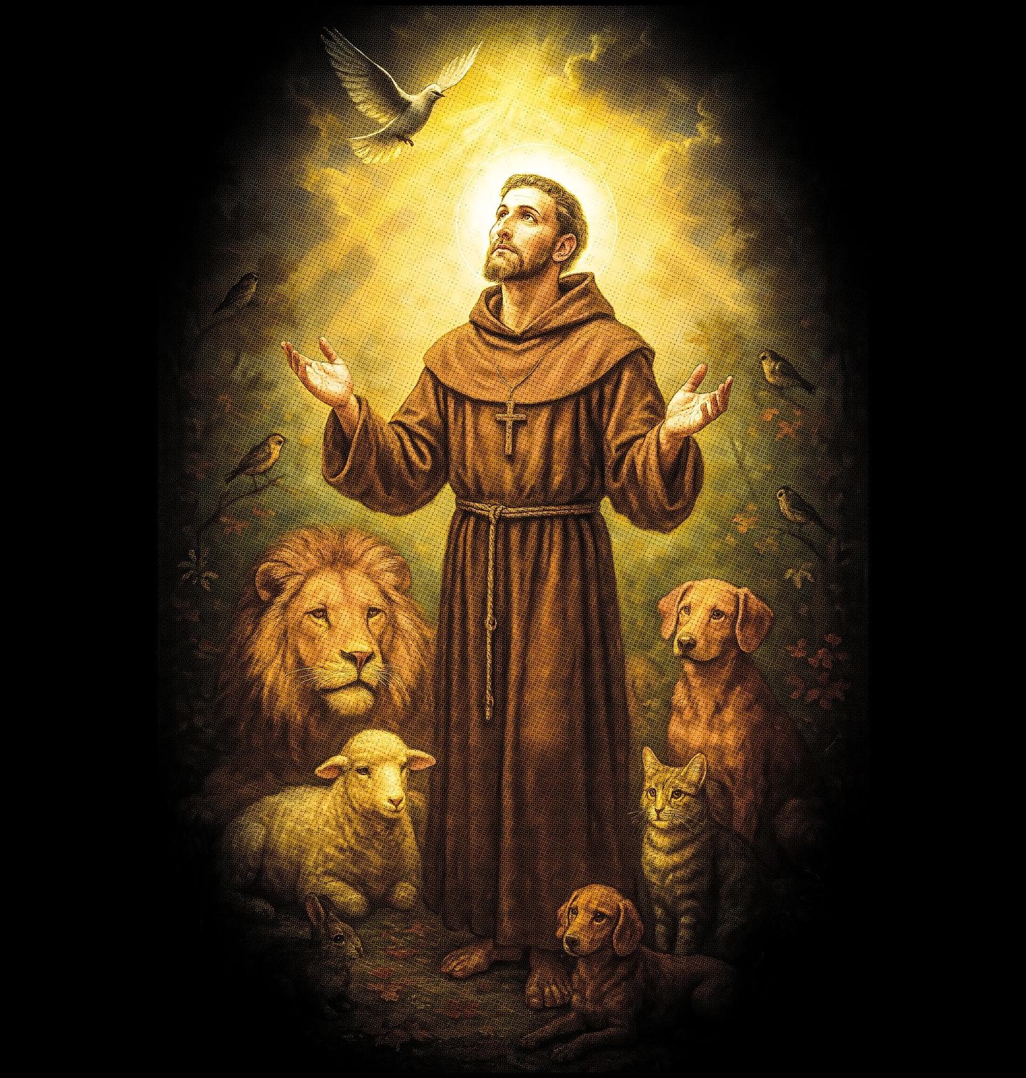 Dámské tričko Svatý František z Assisi. Tento silný a klidný motiv zobrazuje svatého Františka z Assisi, jednoho z nejvýznamnějších světců, obklopeného zvířaty a zalitého zlatým světlem. Svatý František byl řeholník, zakladatel žebravého řádu. Lev, beránek, ptáci i domácí zvířata zde představují harmonii mezi člověkem a přírodou.