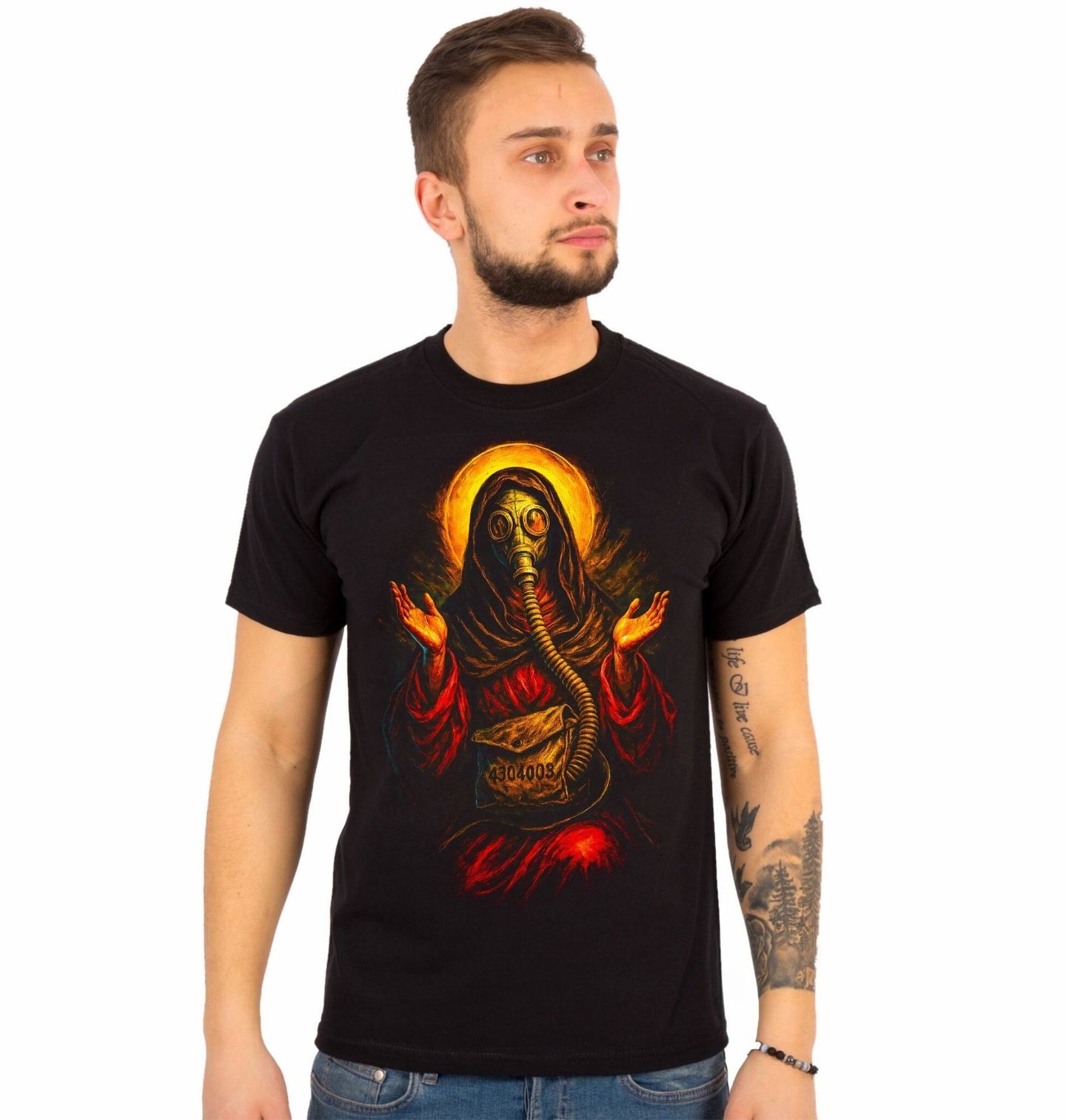 Pánské tričko Svatý Ježíš v Apokalyptické Masce. Temný a silně symbolický motiv, který propojuje spiritualitu s dystopickou vizí světa. Postava připomíná svatého nebo náboženskou ikonu, ale místo tradičního zobrazení má nasazenou plynovou masku – jako by přežila konec světa. Tento kontrast vytváří silný vizuální i myšlenkový efekt. Detailní zpracování, dramatické barvy a výrazná kompozice dělají z tohoto motivu ideální volbu pro ty, kdo mají rádi hlubší význam, temnou estetiku a originální styl.