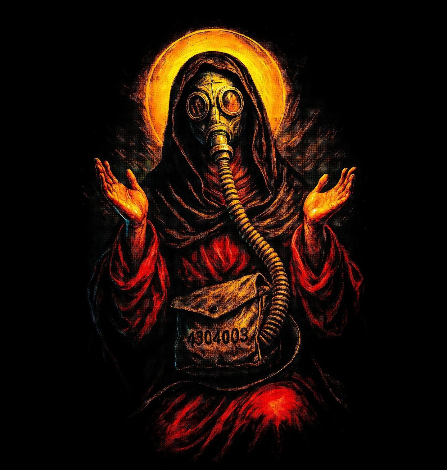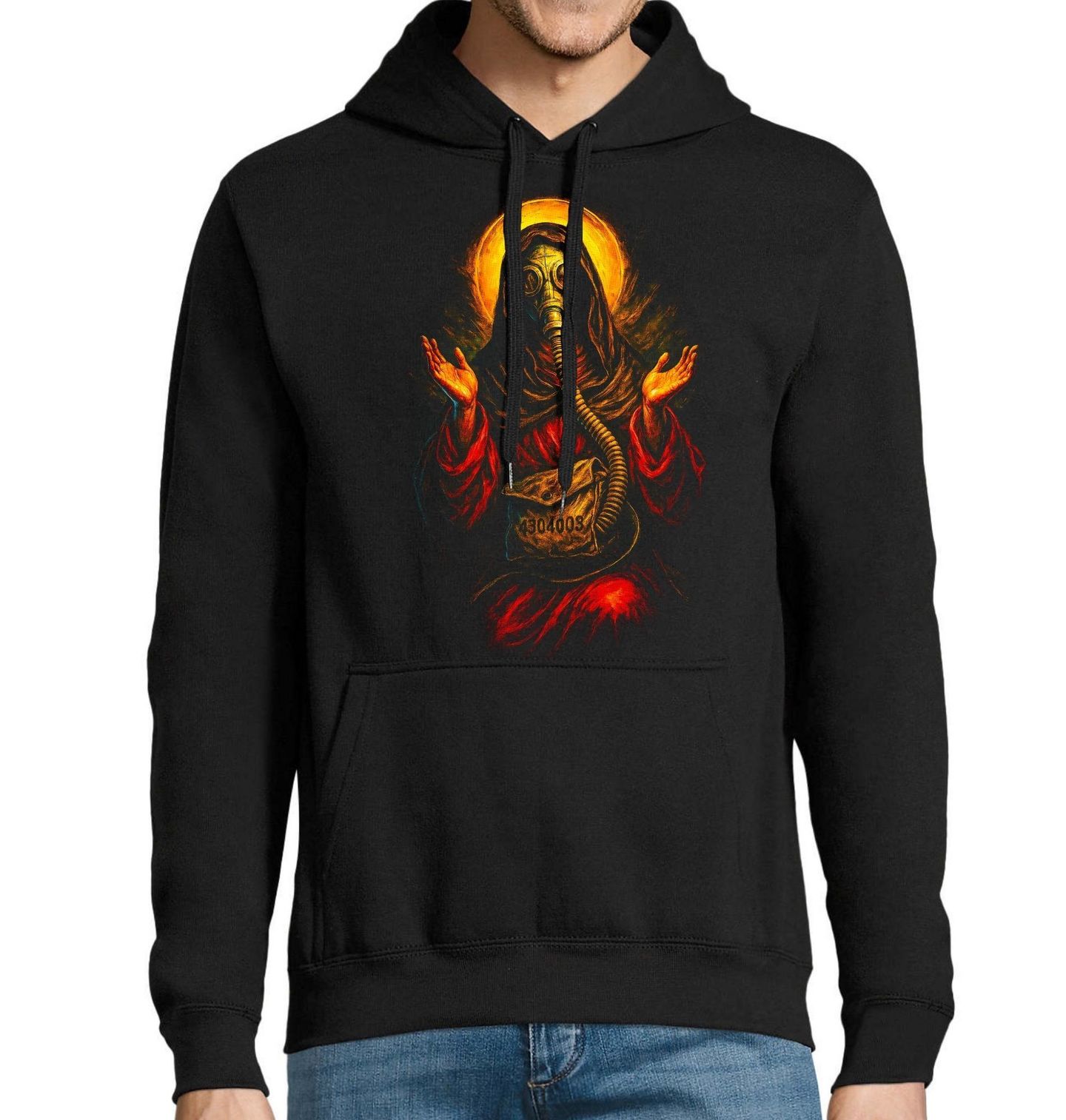 Pánská mikina Svatý Ježíš v Apokalyptické Masce. Temný a silně symbolický motiv, který propojuje spiritualitu s dystopickou vizí světa. Postava připomíná svatého nebo náboženskou ikonu, ale místo tradičního zobrazení má nasazenou plynovou masku – jako by přežila konec světa. Tento kontrast vytváří silný vizuální i myšlenkový efekt. Detailní zpracování, dramatické barvy a výrazná kompozice dělají z tohoto motivu ideální volbu pro ty, kdo mají rádi hlubší význam, temnou estetiku a originální styl.