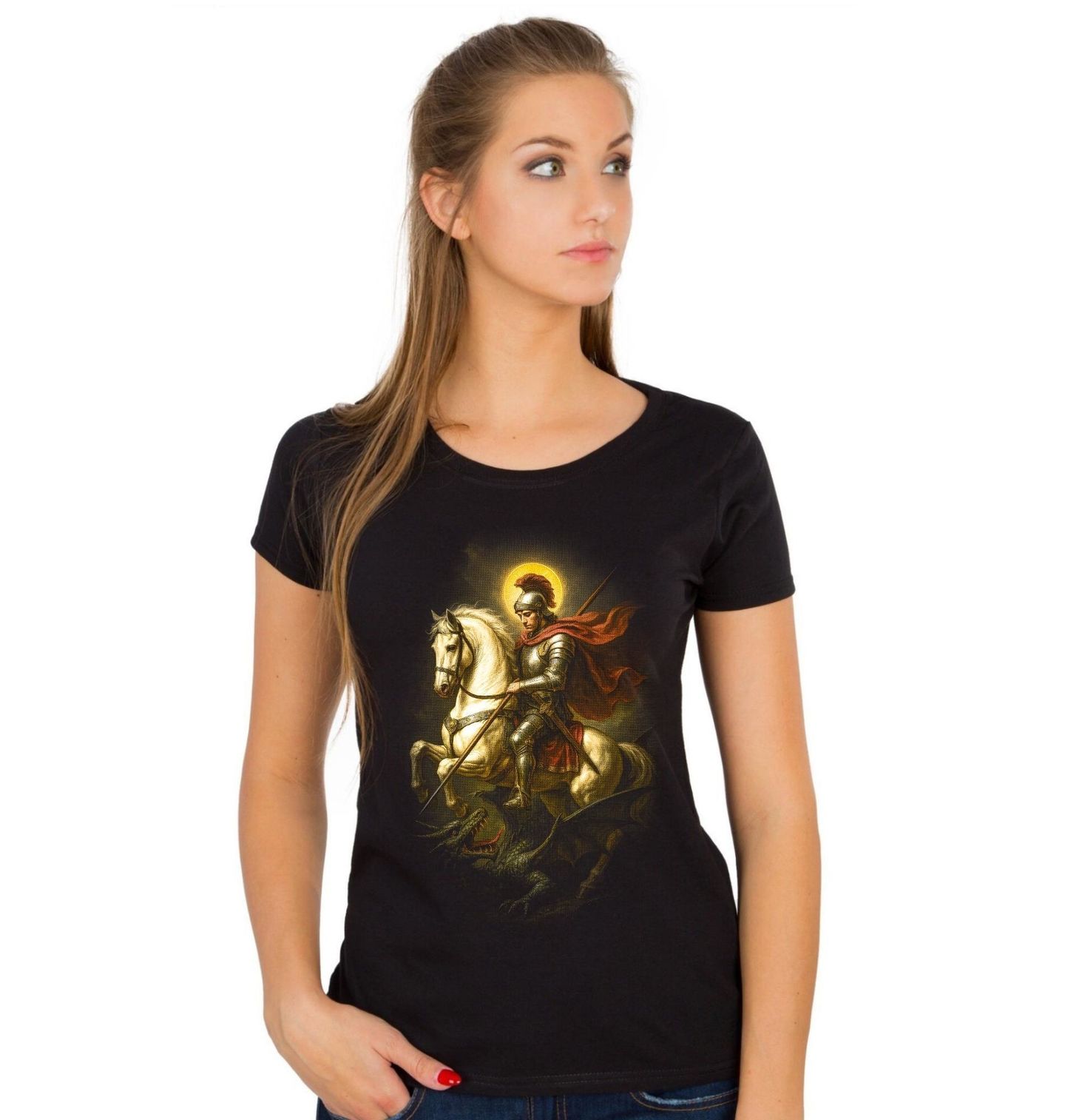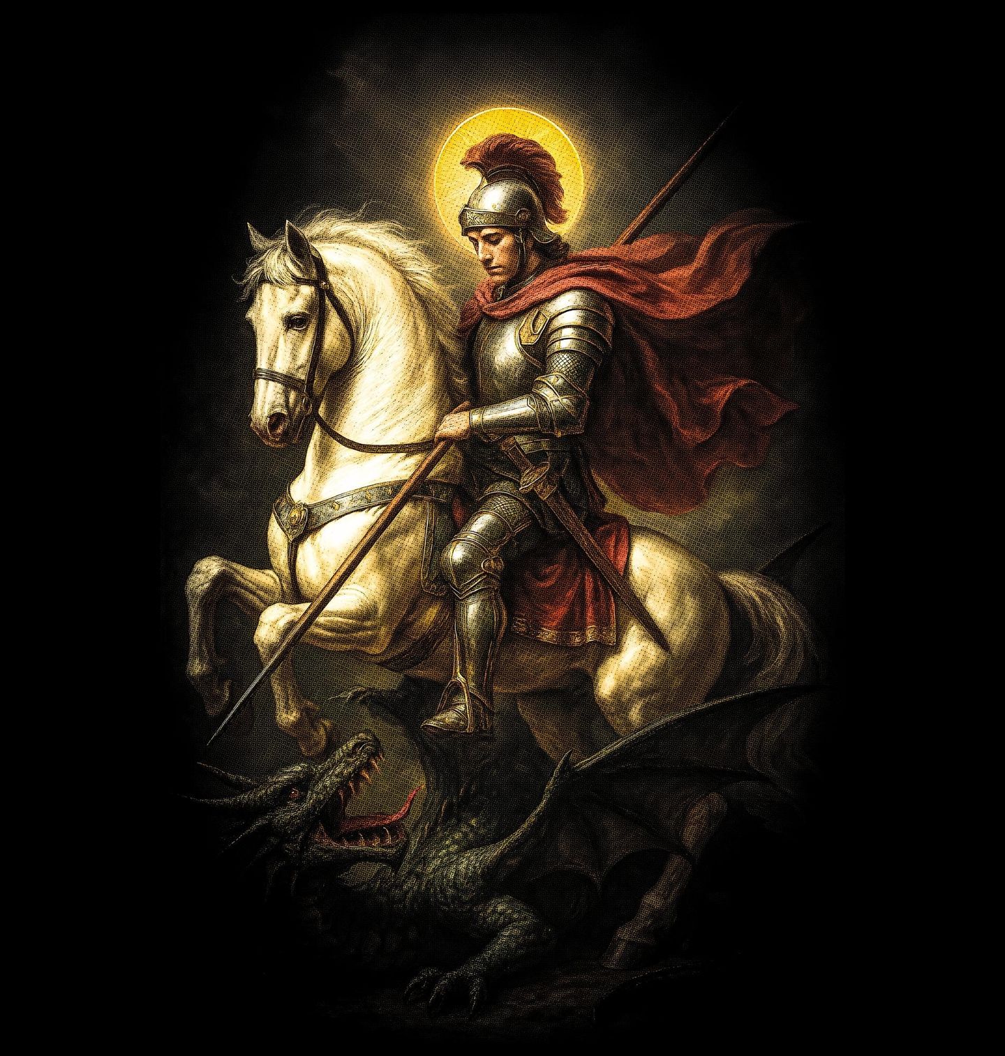 Dámské tričko Svatý Jiří bojující s Drakem. Tento ikonický a duchovně silný motiv zobrazuje svatého Jiřího bojujícího s drakem, jednu z nejznámějších křesťanských legend symbolizujících vítězství dobra nad zlem. Svatý Jiří je zde vyobrazen jako rytíř a bílý kůň, obklopen zlatou září svatosti, v okamžiku rozhodujícího boje proti temným silám. Ideální pro všechny věřící v křesťanství.