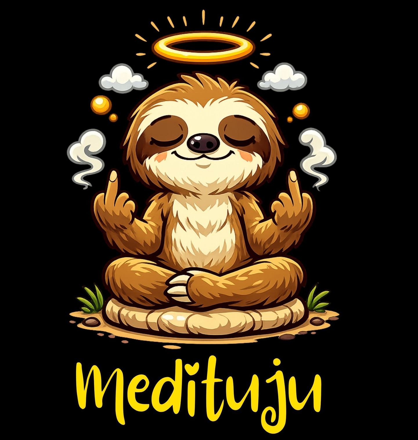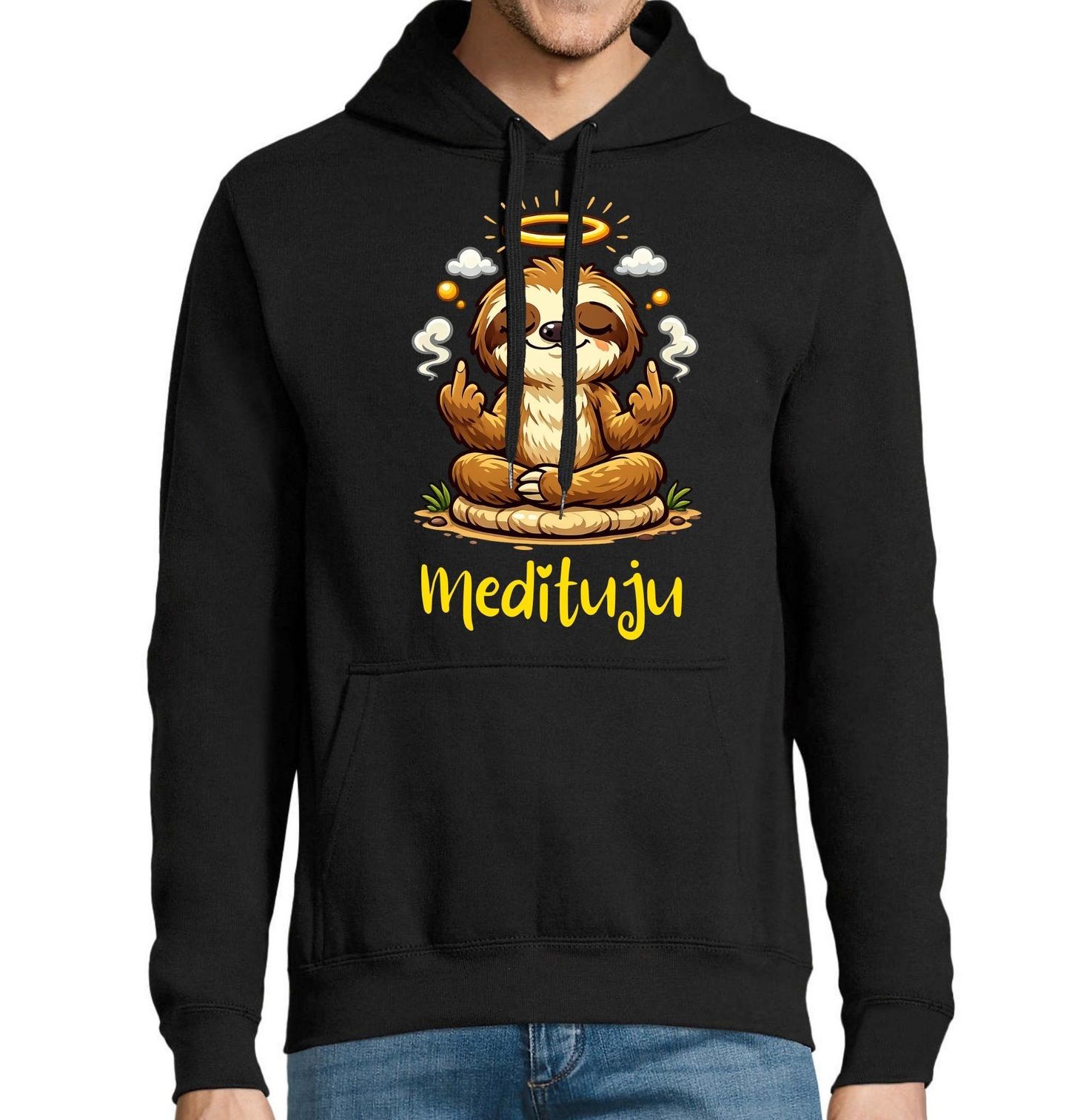 Pánská mikina Svatý Lenochod Medituju. Originální motiv roztomilého lenochoda v hluboké meditaci, který s humorem ukazuje, že klid a pohoda jdou ruku v ruce s osobitým stylem. Tento design spojuje zenovou atmosféru, relaxaci a nadhled nad světem. Ideální pro všechny, kdo milují lenochody, meditace a chtějí vyjádřit svůj klidný přístup k životu s kapkou rebelství.