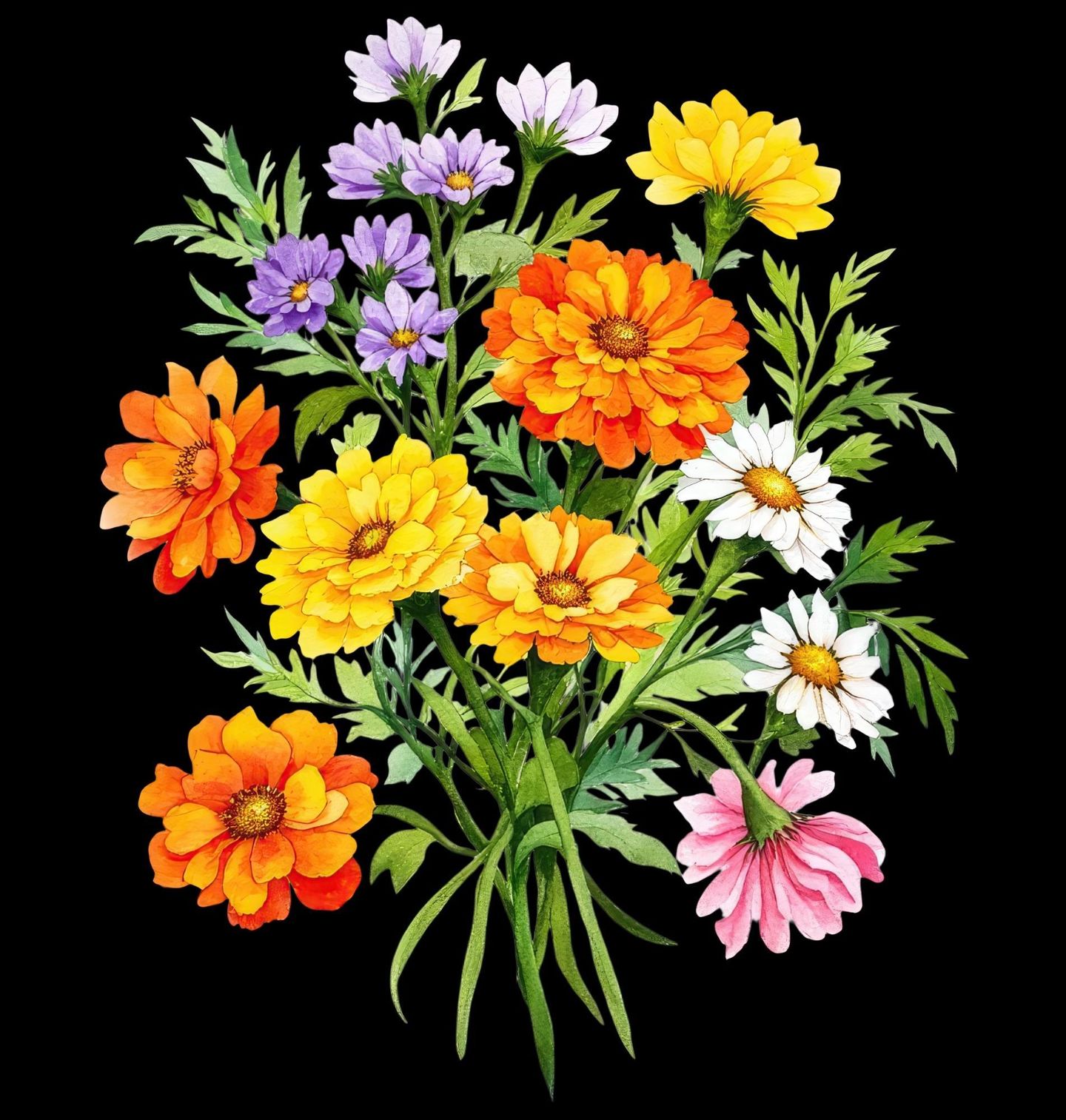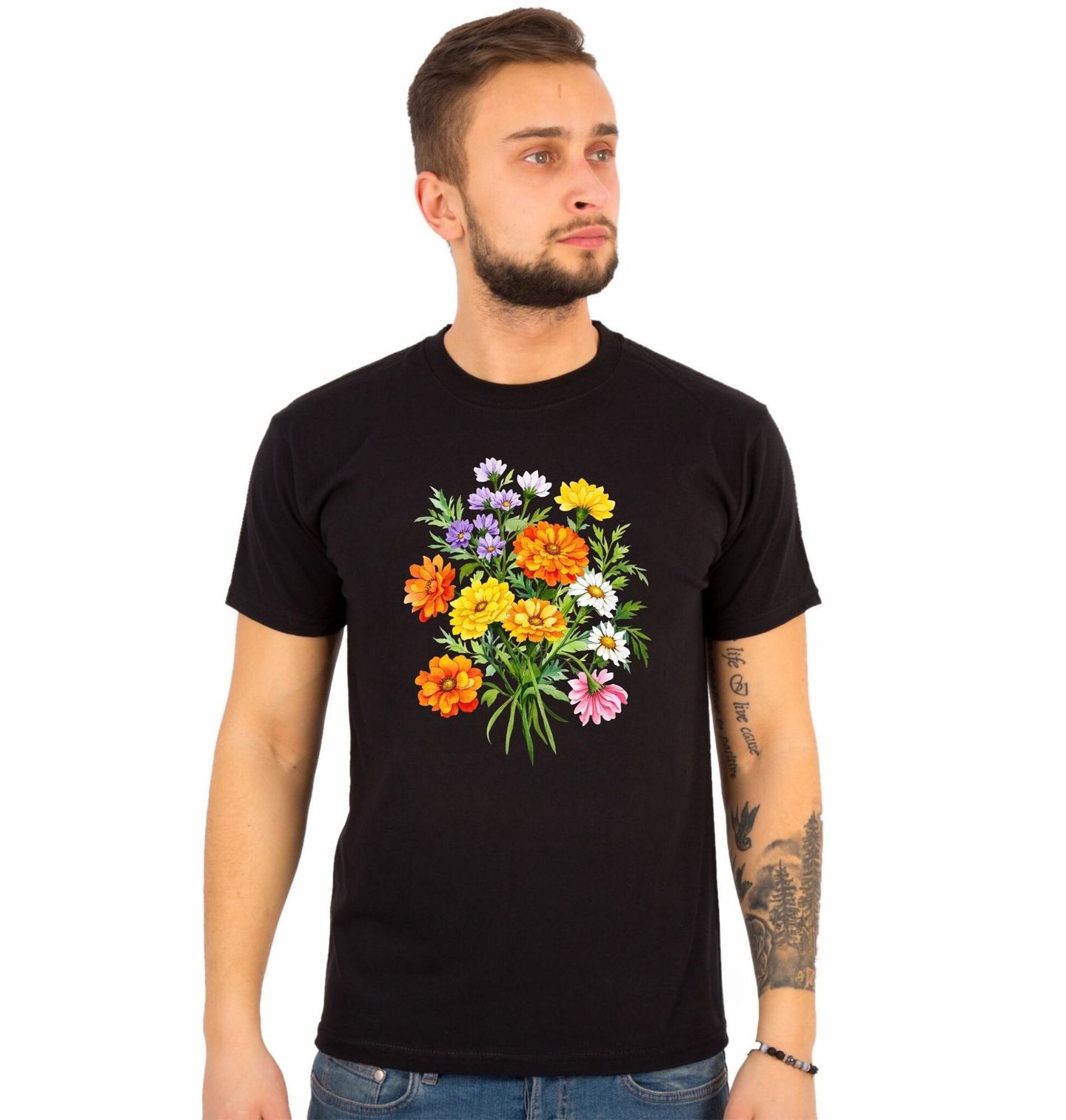 Pánské tričko Svazek Letních květin. Tento nádherný květinový motiv v sobě nese svěžest, barvy a radost. Ručně kreslené květiny jako měsíček lékařský (oranžový a žlutý), kopretina bílá, echinacea (růžová) a fialová astra tvoří harmonický pugét, který rozzáří každý den.
