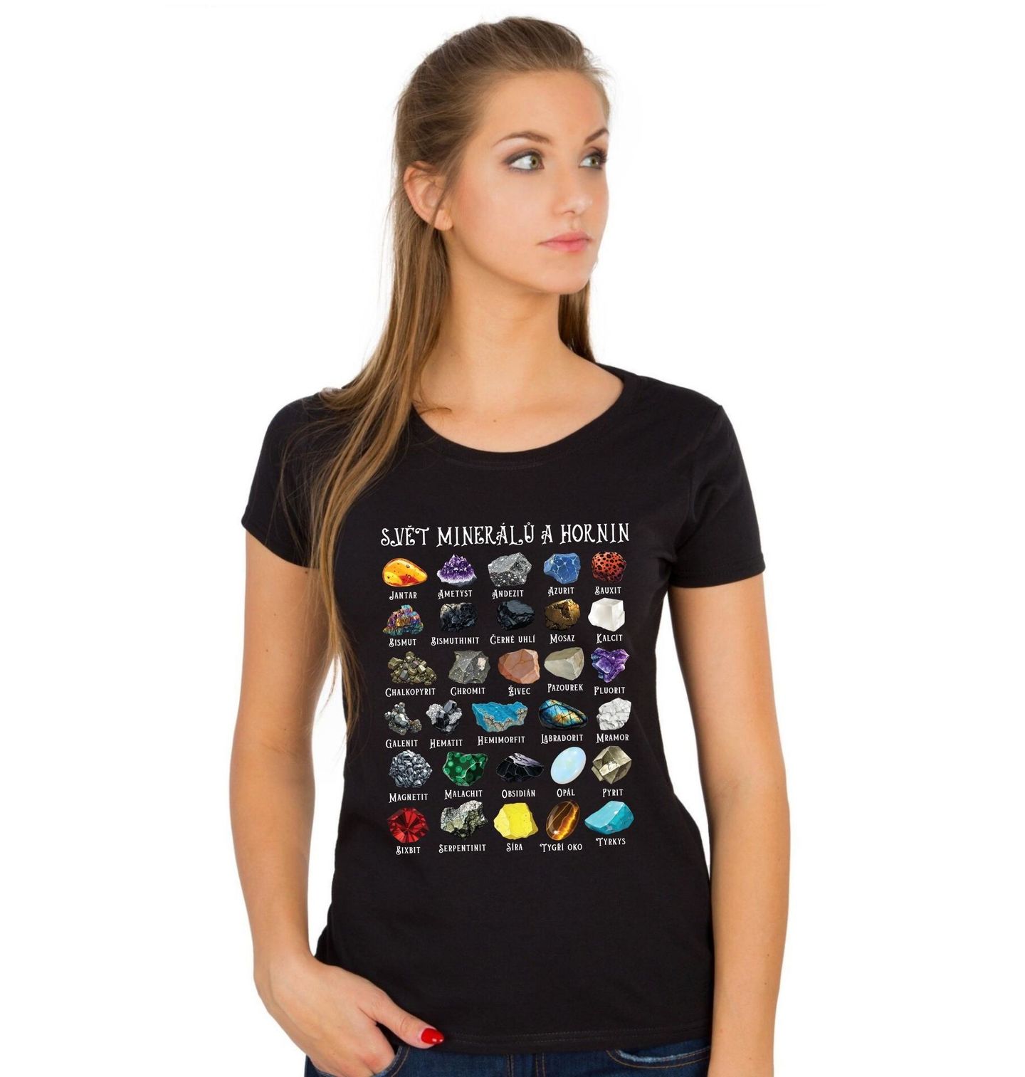 Dámské tričko Svět Minerálů a Hornin. Originální motiv přehledně zobrazuje různé kameny, minerálů a hornin. Na motivu najdeš známé minerály a horniny například: Jantar, Ametyst, Andezit, Azurit, Bauxit, Bismut, Bismuthinit, Černé uhlí, Mosaz, Kalcit, Chalkopyrit, Chromit, Živec, Pazourek, Fluorit, Galenit, Hematit, Hemimorfit, Labradorit, Mramor, Magnetit, Malachit, Obsidián, Opál, Pyrit, Bixbit, Serpentinit, Síra, Tygří oko, Tyrkys.