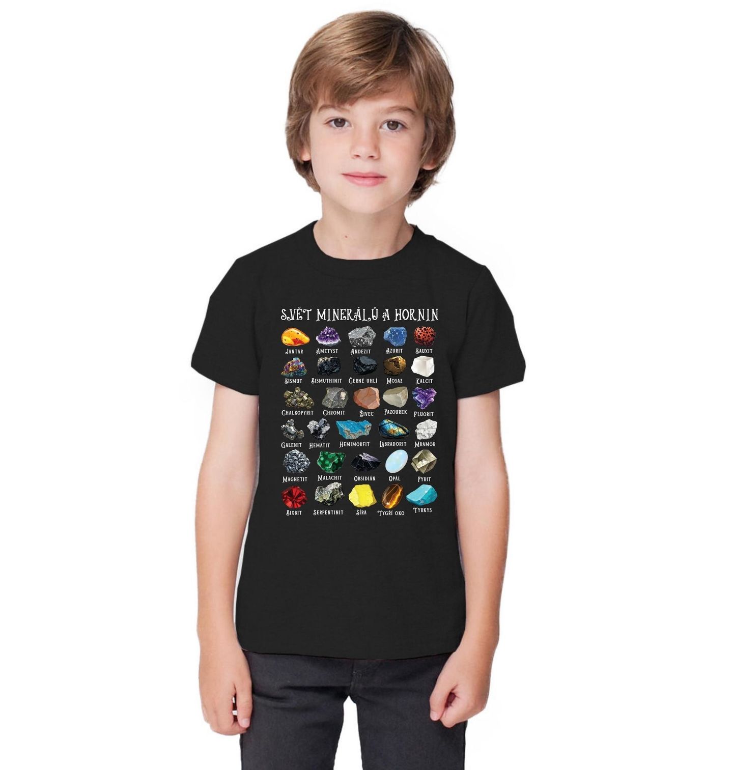 Dětské tričko Svět Minerálů a Hornin. Originální motiv přehledně zobrazuje různé kameny, minerálů a hornin. Na motivu najdeš známé minerály a horniny například: Jantar, Ametyst, Andezit, Azurit, Bauxit, Bismut, Bismuthinit, Černé uhlí, Mosaz, Kalcit, Chalkopyrit, Chromit, Živec, Pazourek, Fluorit, Galenit, Hematit, Hemimorfit, Labradorit, Mramor, Magnetit, Malachit, Obsidián, Opál, Pyrit, Bixbit, Serpentinit, Síra, Tygří oko, Tyrkys.