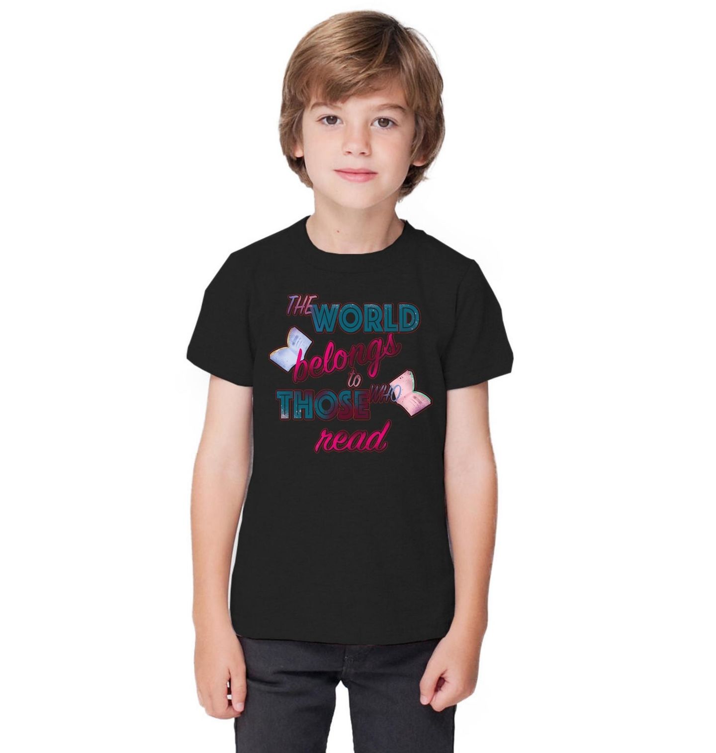 Dětské tričko Svět patří těm, kdo čtou The world belongs to those who read. Stylový motiv s otevřenými knihami a výrazným textem oslavuje radost ze čtení a sílu příběhů. Tento design je ideální pro všechny, kdo milují knihy a věří, že právě ony dokážou měnit pohled na svět. Hlavní nápis na motivu zdůrazňuje, že čtení patří těm, kteří se nebojí snít, objevovat a přemýšlet.
