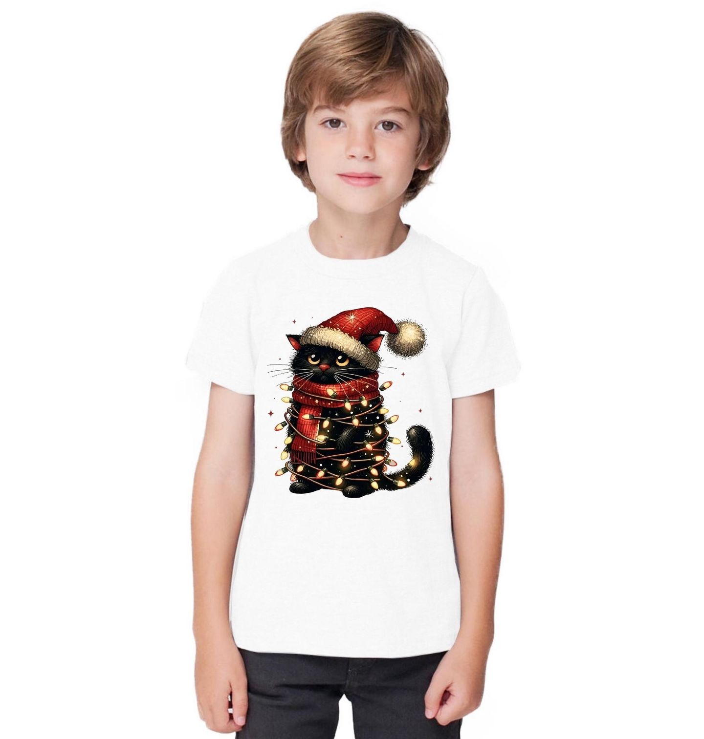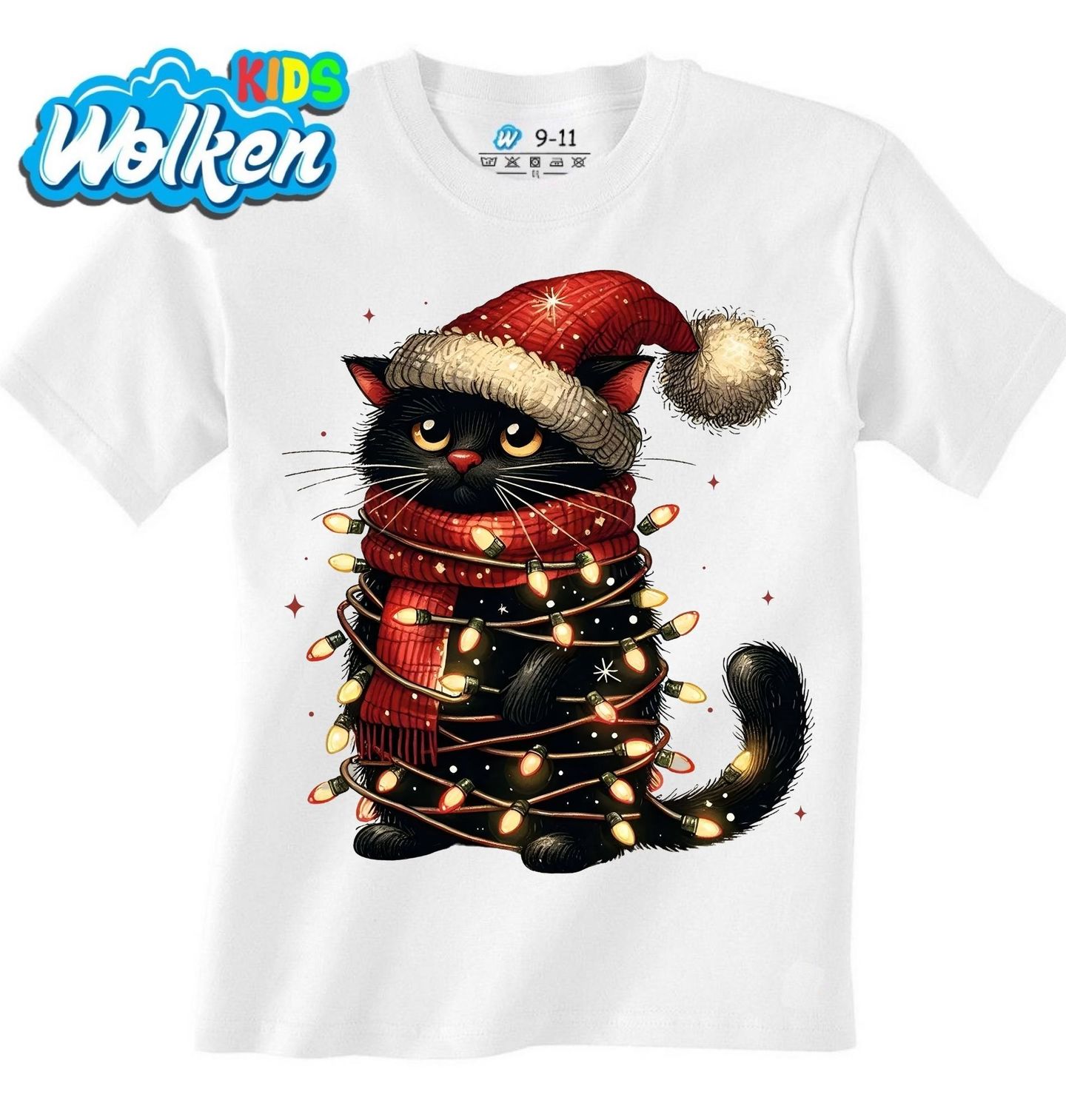 Dětské tričko Svítící Vánoční Kočka. Roztomilá černá kočka v čepici, šále a zamotaná do světýlek je dokonalým ztělesněním sváteční pohody i mírného chaosu, který Vánoce často přinášejí. Tento vtipný motiv ocení každý milovník koček, který ví, že u stromečku bez chlupáče to prostě není ono.