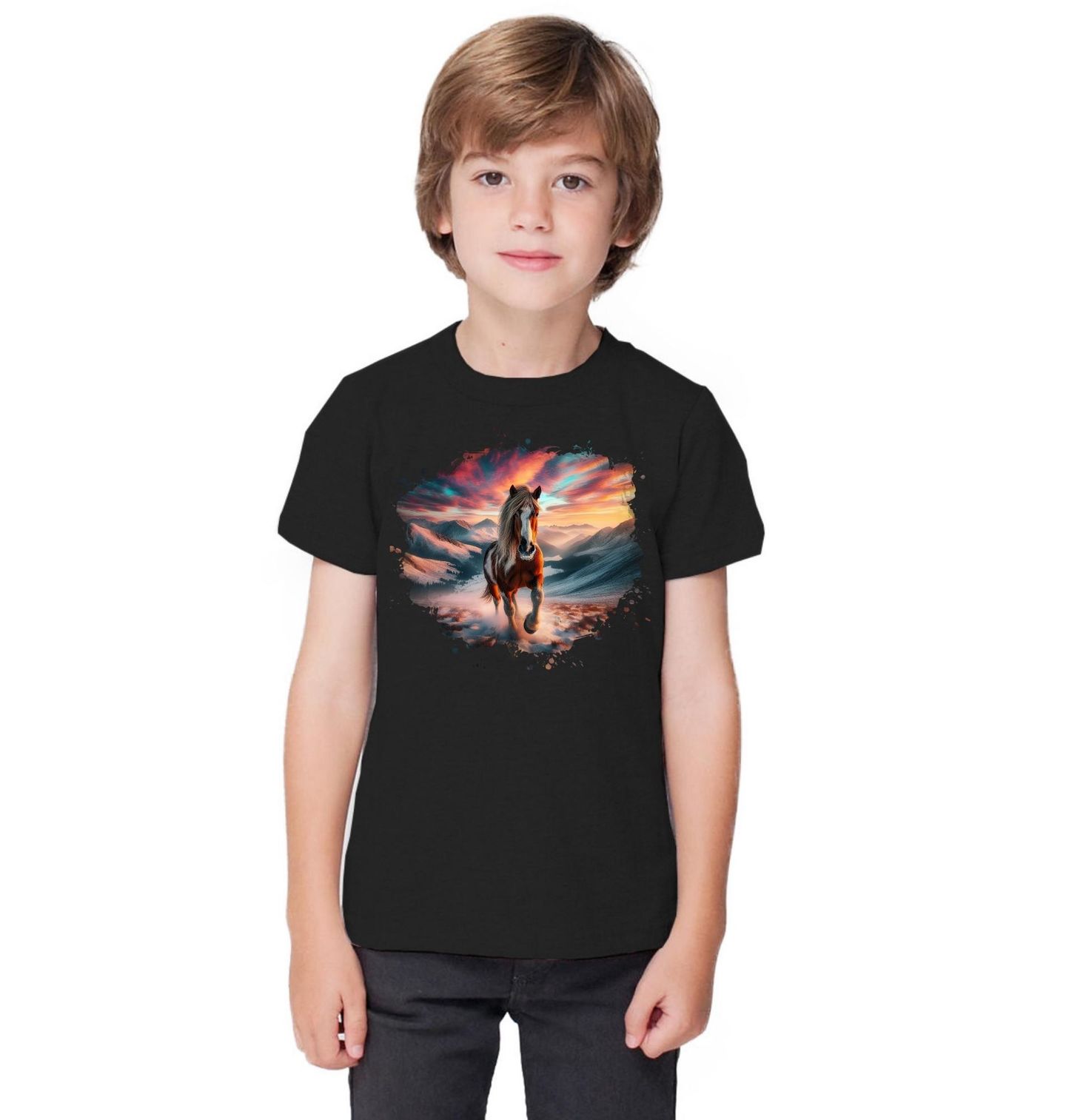 Dětské tričko Svobodný Kůň v Horách. Tenhle kůň si na nic nehraje. Prostě běží, protože může. Před ním otevřené hory, pod kopyty sníh a v hlavě klid, který dneska hledáme všichni. Motiv zachycuje sílu, eleganci a nespoutanost, kterou koně mají přirozeně v sobě. Je to obraz svobody, ticha a prostoru, kde se dýchá trochu líp než ve městě.