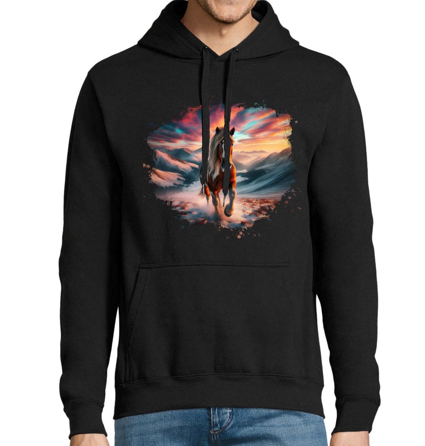 Pánská mikina Svobodný Kůň v Horách. Tenhle kůň si na nic nehraje. Prostě běží, protože může. Před ním otevřené hory, pod kopyty sníh a v hlavě klid, který dneska hledáme všichni. Motiv zachycuje sílu, eleganci a nespoutanost, kterou koně mají přirozeně v sobě. Je to obraz svobody, ticha a prostoru, kde se dýchá trochu líp než ve městě.