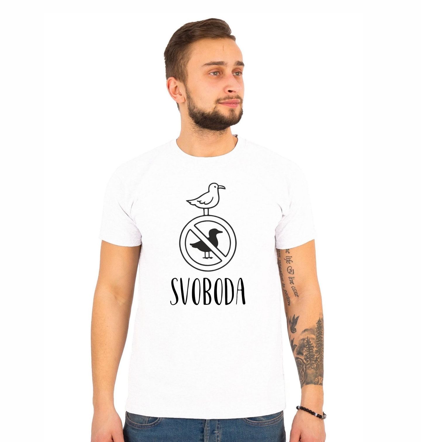 Pánské tričko Svobodný Pták. Originální motiv, který si pohrává s významy a symbolem svobody. Kontrast, kdy je pták vyobrazený zároveň jako svobodný i omezený, vytváří silné vizuální sdělení. Motiv pracuje s prvkem, který připomíná značka zákazu, a přitom ho obrací naruby pomocí jednoduché, přehledné grafiky.