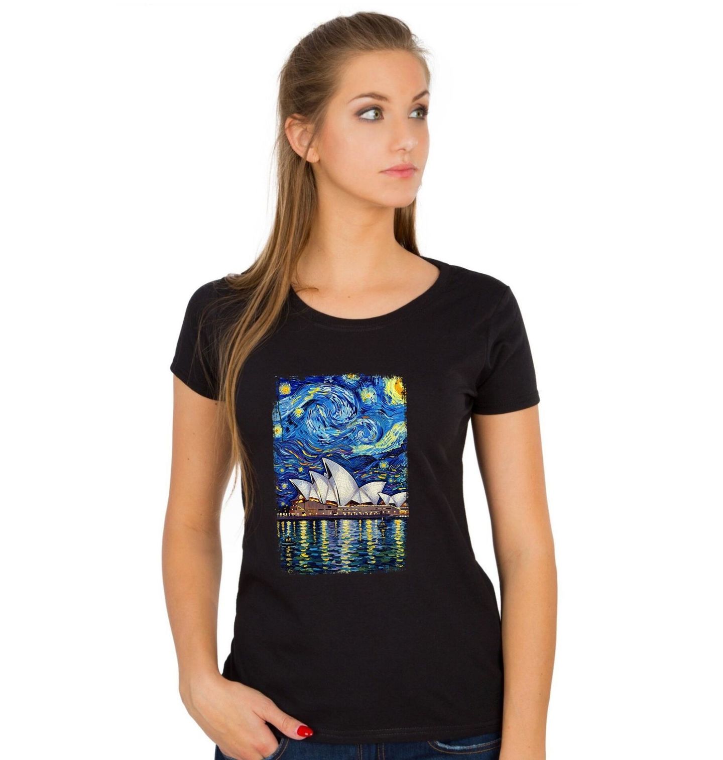 Dámské tričko Sydney Opera ve Hvězdné noci. Nádherný motiv, který spojuje slavný obraz Hvězdná noc a jedinečný styl malíře Vincenta van Gogha s ikonickou stavbou světové architektury – Opera v Sydney. Silueta Opery se svými typickými „plachtami“ vystupuje nad zářící hladinou vody, zatímco nad ní se točí magická noční obloha.