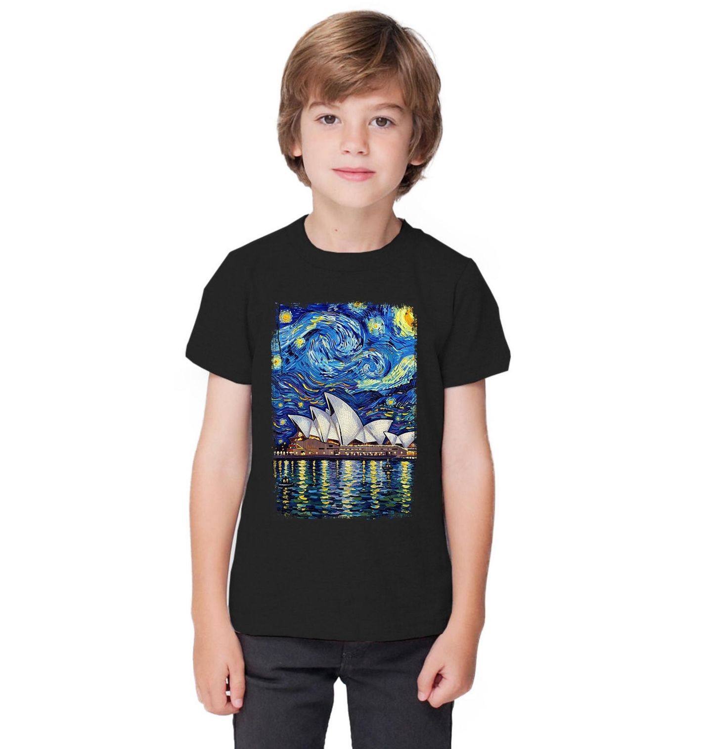 Dětské tričko Sydney Opera ve Hvězdné noci. Nádherný motiv, který spojuje slavný obraz Hvězdná noc a jedinečný styl malíře Vincenta van Gogha s ikonickou stavbou světové architektury – Opera v Sydney. Silueta Opery se svými typickými „plachtami“ vystupuje nad zářící hladinou vody, zatímco nad ní se točí magická noční obloha.