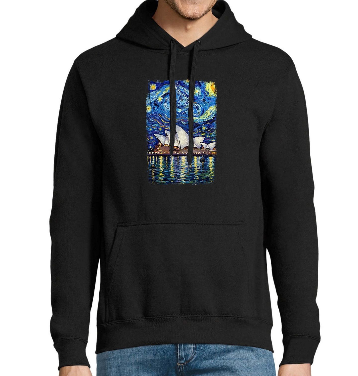 Pánská mikina Sydney Opera ve Hvězdné noci. Nádherný motiv, který spojuje slavný obraz Hvězdná noc a jedinečný styl malíře Vincenta van Gogha s ikonickou stavbou světové architektury – Opera v Sydney. Silueta Opery se svými typickými „plachtami“ vystupuje nad zářící hladinou vody, zatímco nad ní se točí magická noční obloha.