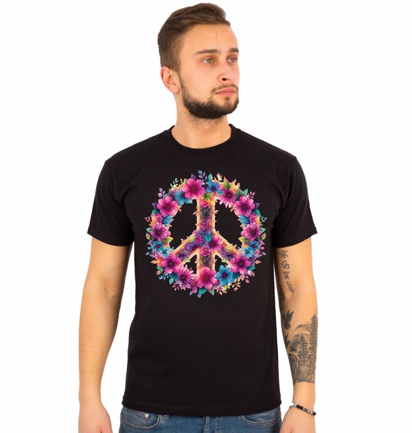 Pánské tričko Symbol Míru z Květin. Jemný a zároveň výrazný motiv spojuje krásu přírody a symboliku klidu. Dominantou designu jsou pestré květiny, které tvoří ikonický znak míru a vytvářejí harmonickou kompozici plnou barev, života a pozitivní energie. Tento motiv je ideální pro všechny, kdo chtějí vyjádřit své hodnoty – svobodu, lásku a mír. Pokud hledáš design, který spojuje styl, přírodu a myšlenku míru, tento motiv s květinami je přesně pro tebe.
