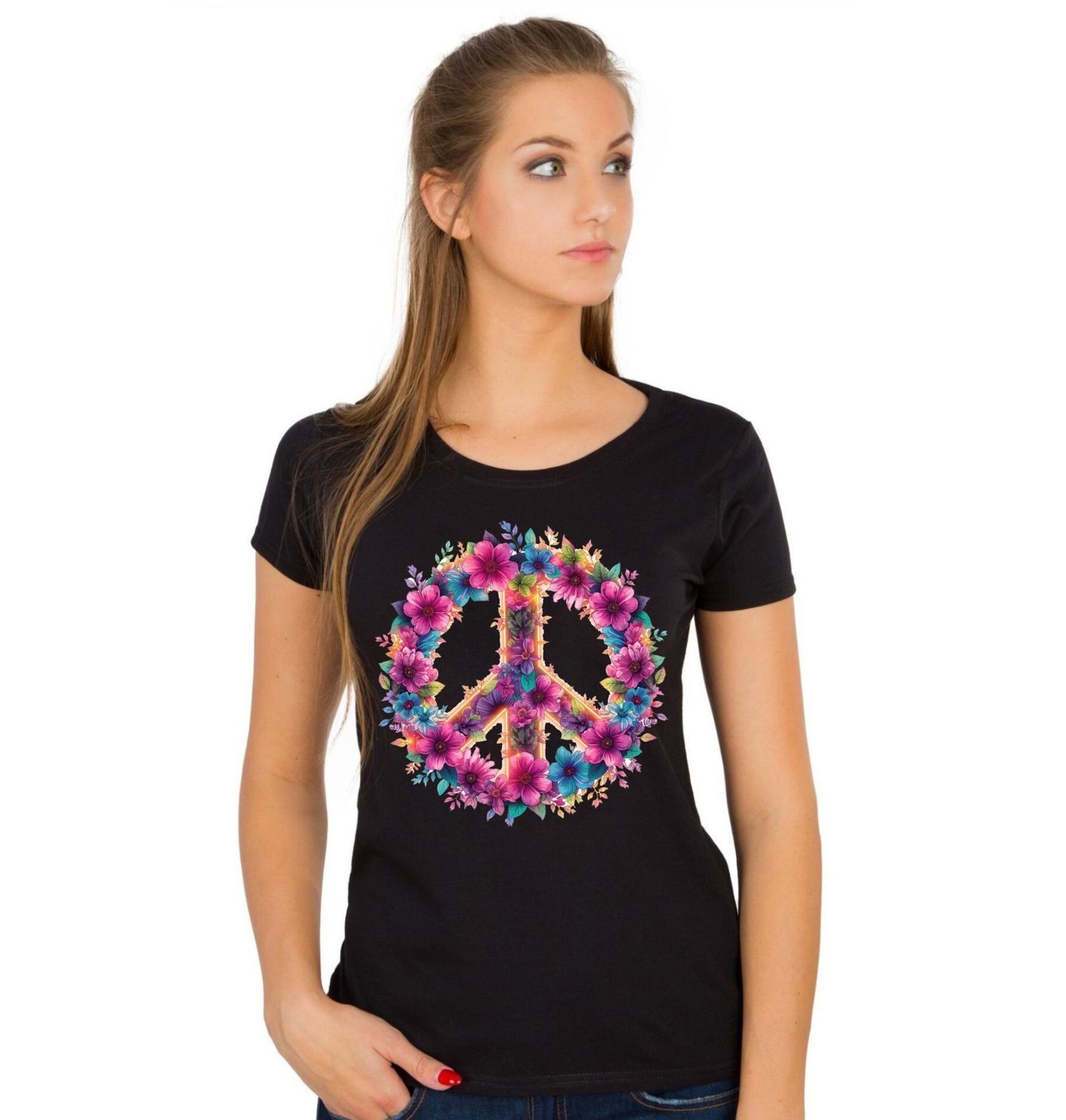 Dámské tričko Symbol Míru z Květin. Jemný a zároveň výrazný motiv spojuje krásu přírody a symboliku klidu. Dominantou designu jsou pestré květiny, které tvoří ikonický znak míru a vytvářejí harmonickou kompozici plnou barev, života a pozitivní energie. Tento motiv je ideální pro všechny, kdo chtějí vyjádřit své hodnoty – svobodu, lásku a mír. Pokud hledáš design, který spojuje styl, přírodu a myšlenku míru, tento motiv s květinami je přesně pro tebe.