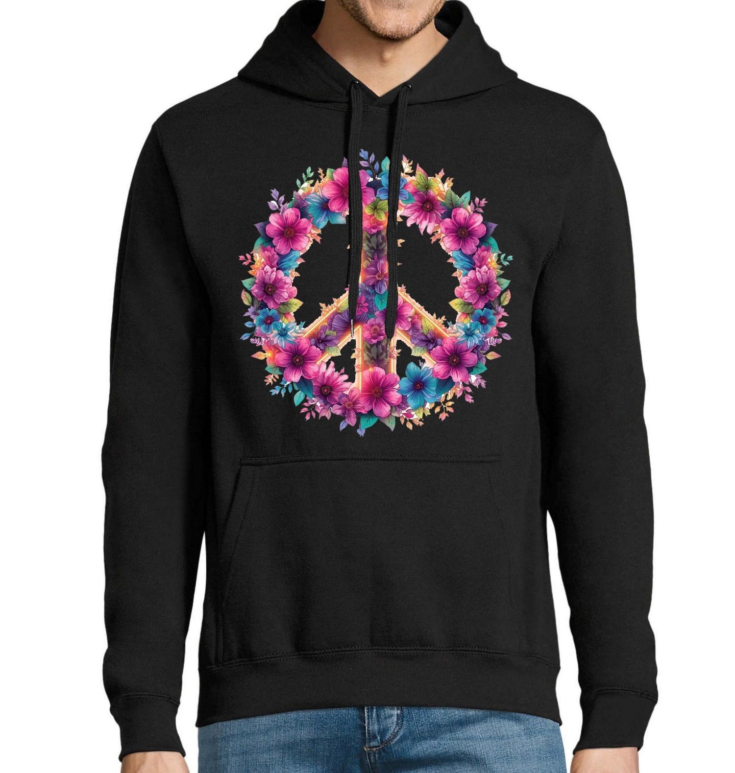 Pánská mikina Symbol Míru z Květin. Jemný a zároveň výrazný motiv spojuje krásu přírody a symboliku klidu. Dominantou designu jsou pestré květiny, které tvoří ikonický znak míru a vytvářejí harmonickou kompozici plnou barev, života a pozitivní energie. Tento motiv je ideální pro všechny, kdo chtějí vyjádřit své hodnoty – svobodu, lásku a mír. Pokud hledáš design, který spojuje styl, přírodu a myšlenku míru, tento motiv s květinami je přesně pro tebe.
