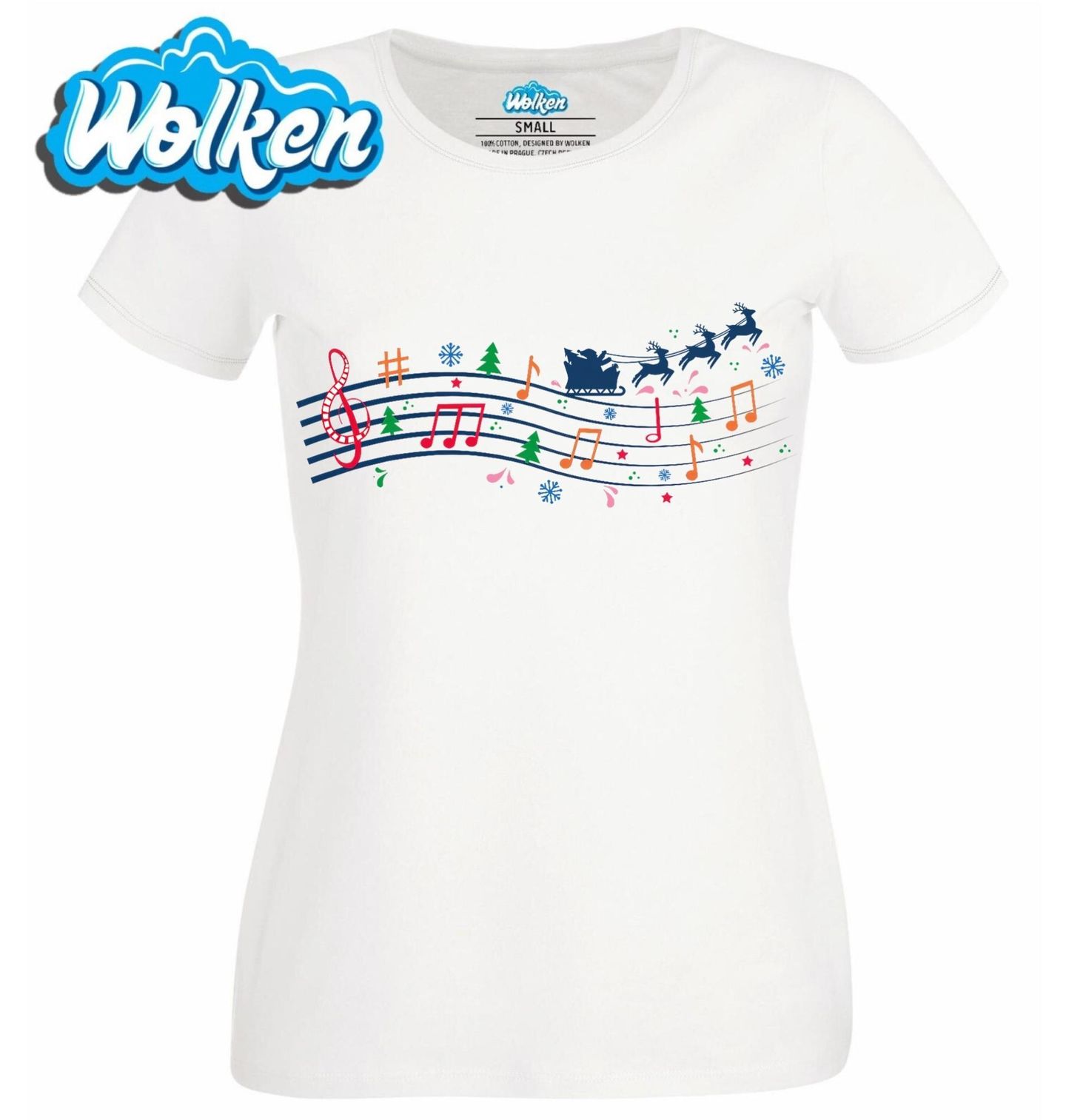 Dámské tričko Symfonie Vánočních Koled. Originální motiv, na kterém Santa se sobím spřežením uhání přímo po kouzelné hudební lince plné barevných tónů a vánočních symbolů. Vánoce a noty se tady spojují do jedinečné podívané, která potěší všechny milovníky hudby i sváteční atmosféry.
