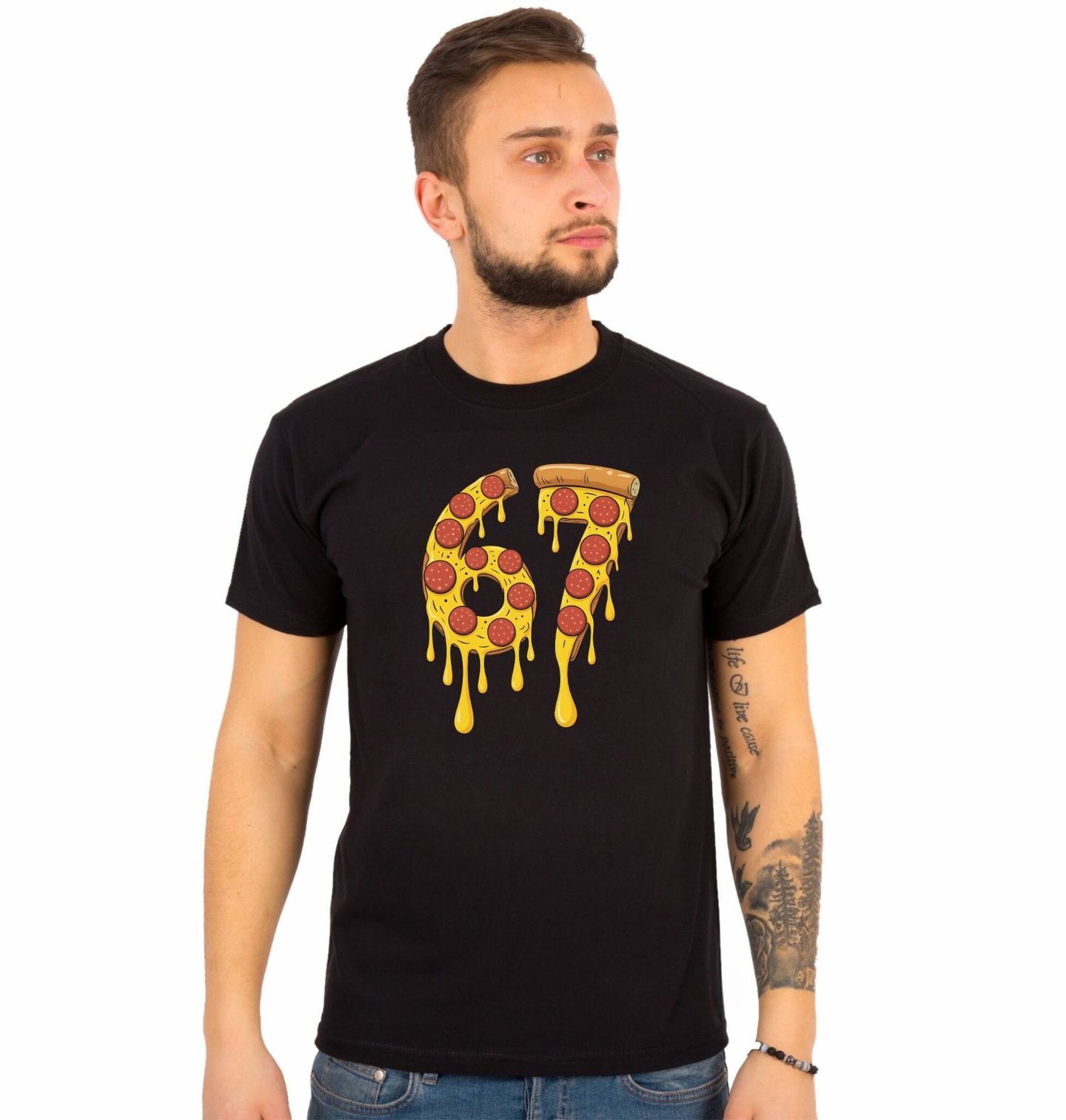 Pánské tričko Sýrová Pizza 67 Six Seven Meme. Lahodná pizza s rozteklým sýrem a plátky pepperoni. Žlutý sýr stéká z okrajů číslic, takže design působí hravě, chutně a zároveň jako moderní meme. Do motivu přirozeně zapadá i anglický výraz six seven, takže grafika hned upoutá pozornost. Ideální pro všechny milovníky originálních potisků, humoru a samozřejmě i pizzy — protože 67 nikdy nevypadalo tak chutně.