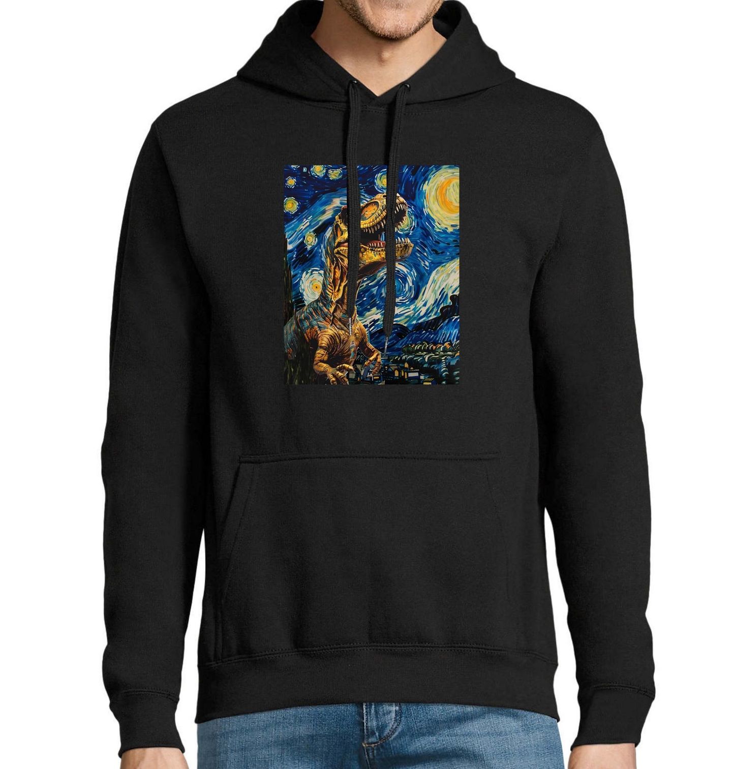 Pánská mikina T-Rex ve Hvězdné noci. Majestátný dinosaurus ve stylu slavného obrazu Hvězdná noc od Vincenta van Gogha. Výrazné barvy a ikonické víry noční oblohy dodávají designu mystický nádech, který si zamilují milovníci jak pravěku, tak malířského umění. Toto tričko je perfektní volbou pro každého, kdo má rád dinosaury, obdivuje umění, a nechce zapadnout.