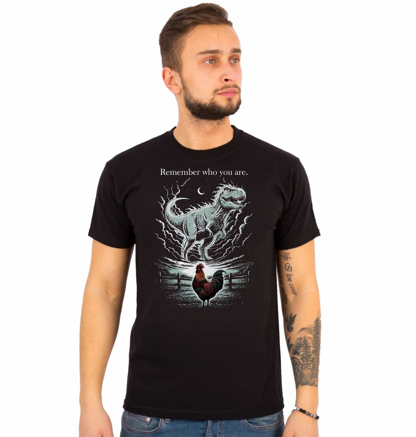 Pánské tričko T-Rex vs Kohout. Tento motiv ukazuje kontrast mezi malým kohoutem a obrovským dinosaurem T-Rex, který symbolizuje vnitřní sílu a sebevědomí. Text „Remember who you are“ znamená „Pamatuj, kdo jsi“ a dodává motivaci i hloubku. Ideální design pro ty, kteří chtějí připomenout svou pravou identitu a sílu.
