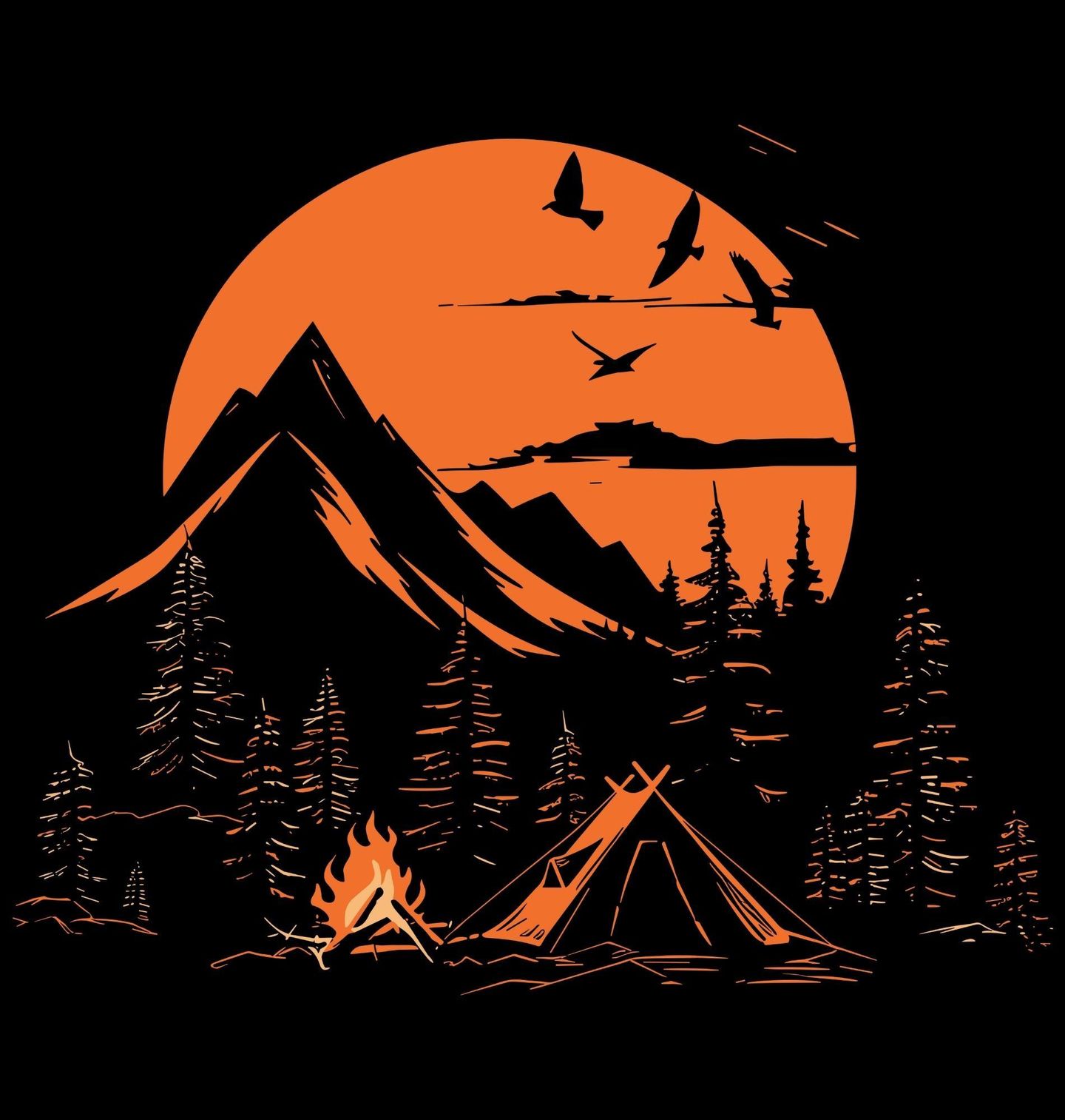 Dámské tričko Táborák při Západu Slunce. Zažij kouzlo noční přírody s tímto výrazným motivem, kde hraje hlavní roli měsíc, les, hory a stan u ohně. Siluety hor a lesů zalité oranžovým měsíčním světlem evokují klid, svobodu a dobrodružství v srdci přírody. Tento design ocení milovníci kempování, outdooru i romantických nocí pod hvězdami.