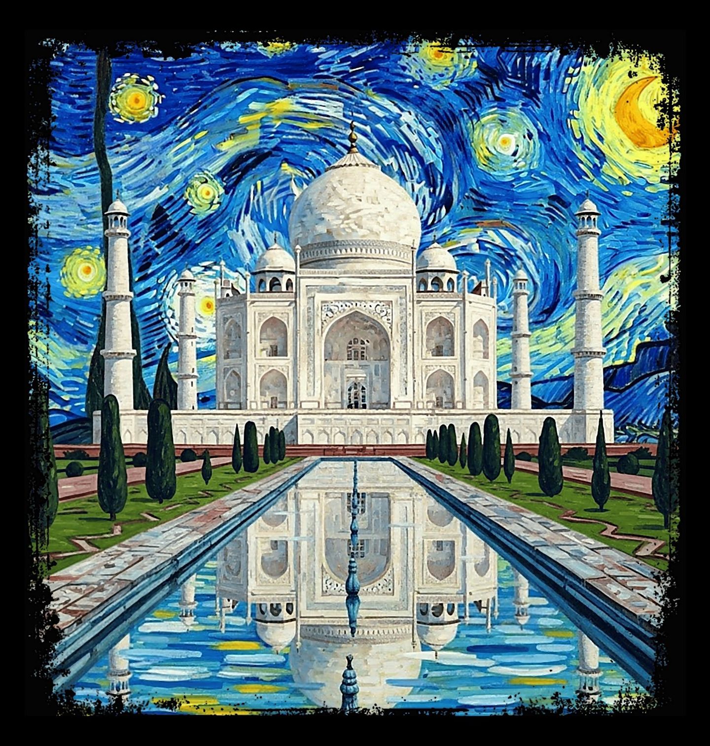 Dámské tričko Taj Mahal v Hvězdné Noci. Tádž Mahal je monumentální pomník a hrobka v Indii. Tento nádherný motiv spojuje legendární monument Taj Mahal s poetickou malířskou atmosférou obrazu Hvězdná Noc, jaký proslavil Vincent Van Gogh. Design je ideální pro milovníky cestování, historie, architektury i umění