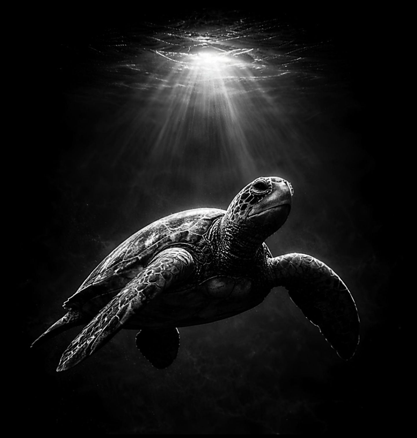Dámské tričko Tajemná Mořská Želva. Design zachycuje krásu podmořského světa, kde mořská želva pluje temnými hlubinami osvětlená paprsky světla z hladiny. Atmosféra klidu a tajemství dělá z tohoto motivu ideální design pro milovníky oceánu, přírody a meditativní estetiky.