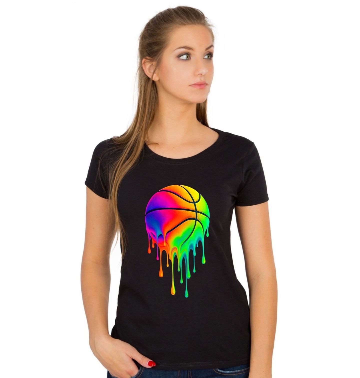 Dámské tričko Tající Basketbalový Míč. Neonový míč je ideální pro každého, kdo miluje sport, barvy a nekonvenční styl. Tento motiv zobrazuje barevně roztavený míč, který doslova kape energií. Vhodné pro fanoušky basketbalu, umění nebo streetwear módy. Vyjádři svou vášeň pro sport naplno a bez kompromisů.