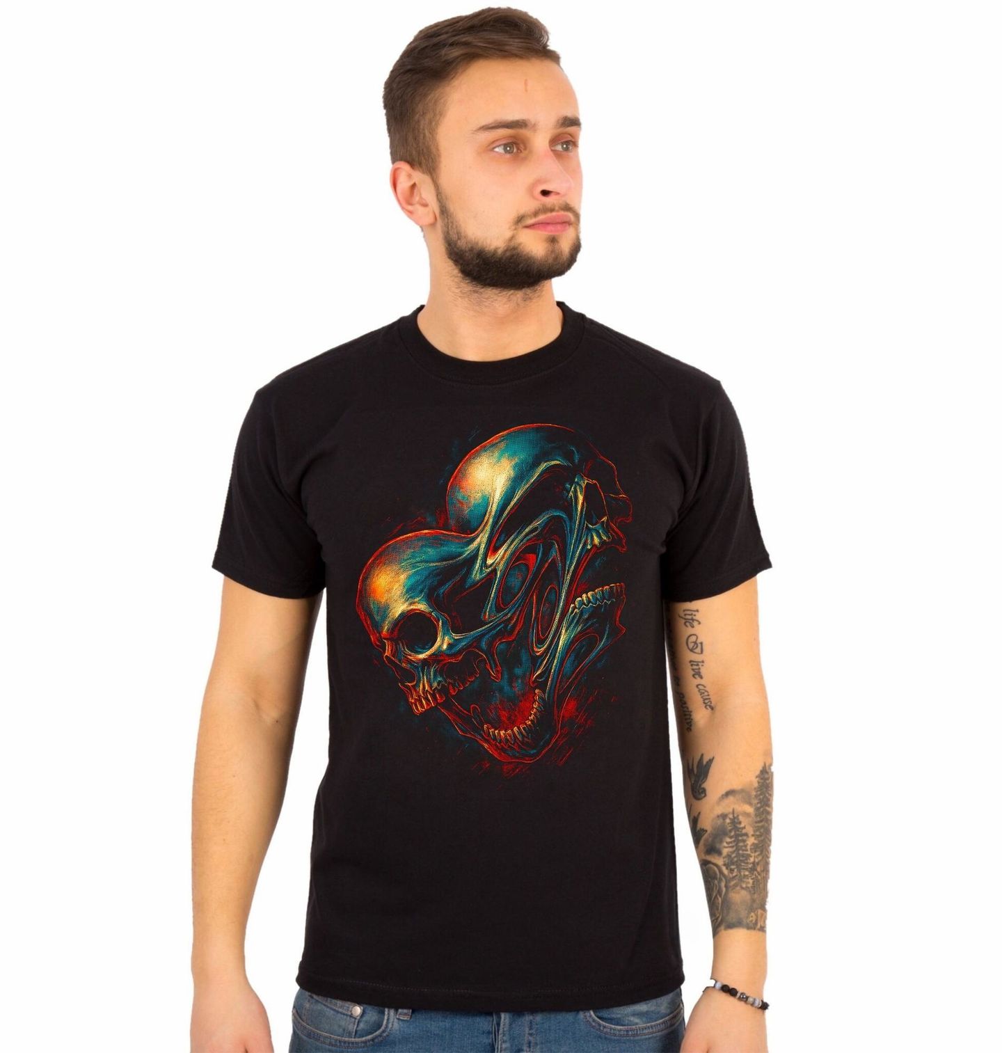 Pánské tričko Tající Lebky Šílenství. Temný a hypnotický motiv zobrazuje deformovanou lebka, jejíž tvar připomíná srdce. Tento originální design propojuje symboly života a smrti do jediné, silné vizuální myšlenky. Srdce zde představuje emoce, zatímco lebka symbolizuje konečnost – dohromady tvoří obraz hluboké, až znepokojivé reality. Spojení srdce a lebka představuje kontrast mezi životem a smrtí, láskou a pomíjivostí – připomínku toho, že i ty nejsilnější emoce mají svůj konec.