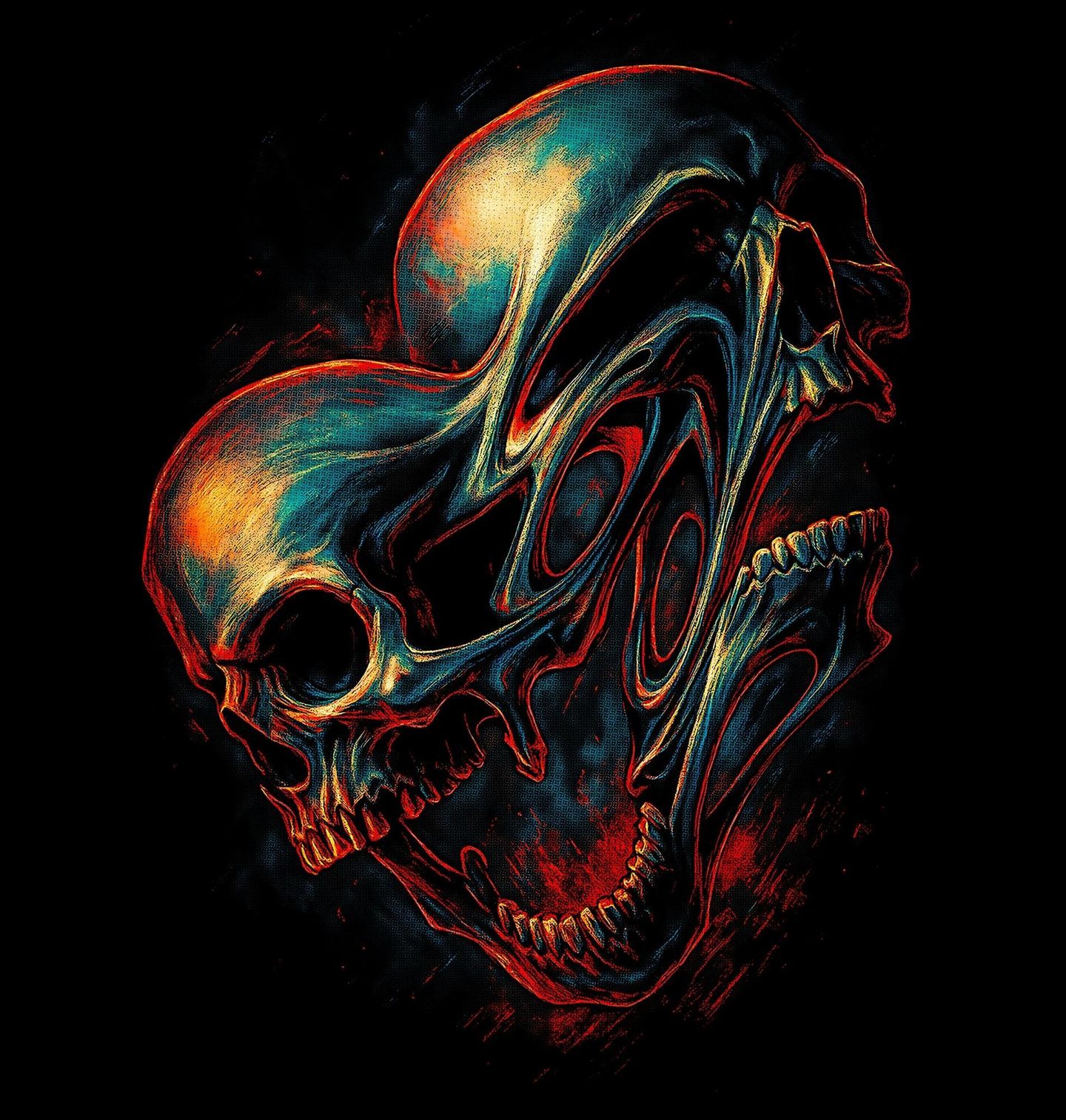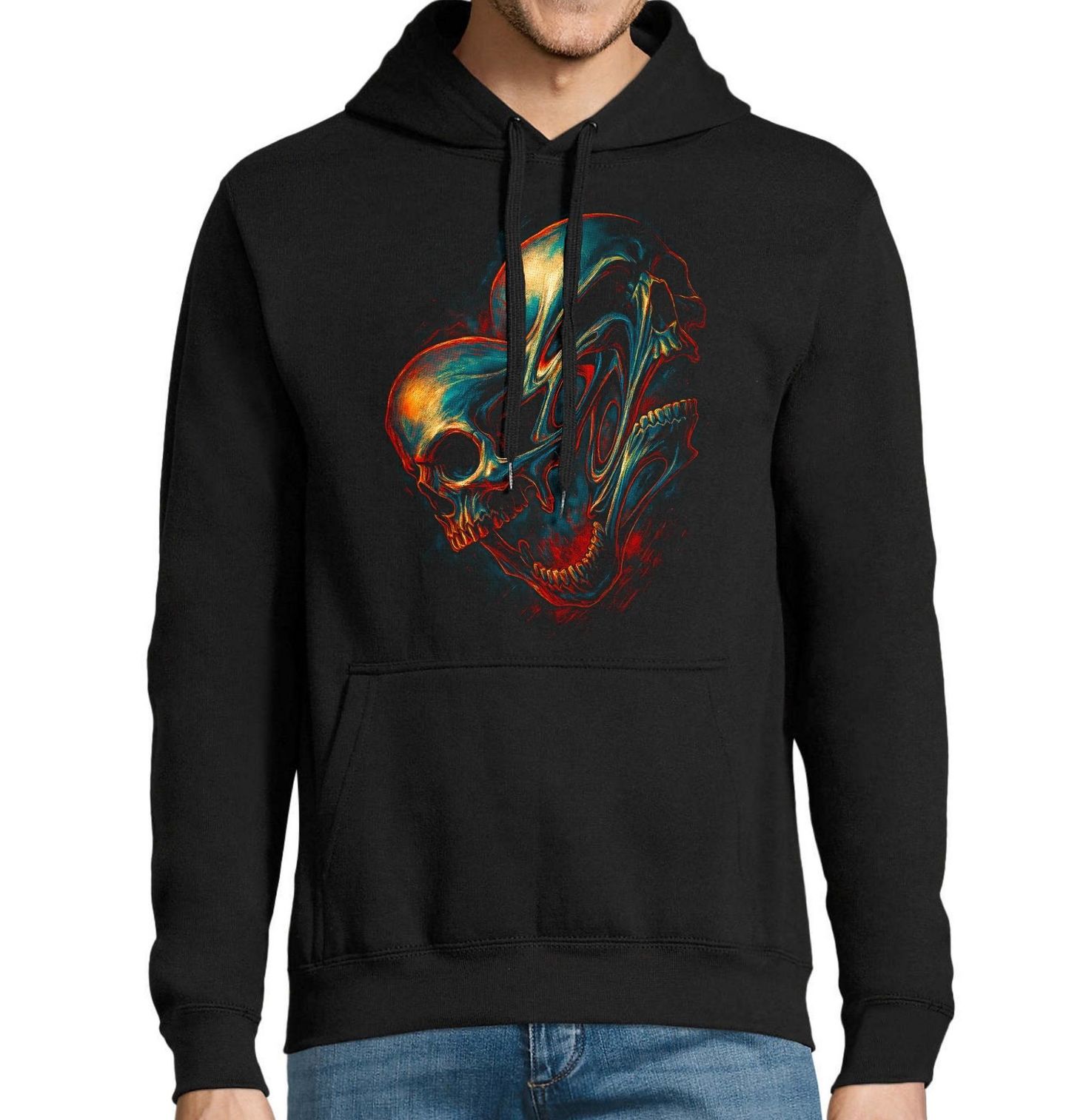 Pánská mikina Tající Lebky Šílenství. Temný a hypnotický motiv zobrazuje deformovanou lebka, jejíž tvar připomíná srdce. Tento originální design propojuje symboly života a smrti do jediné, silné vizuální myšlenky. Srdce zde představuje emoce, zatímco lebka symbolizuje konečnost – dohromady tvoří obraz hluboké, až znepokojivé reality. Spojení srdce a lebka představuje kontrast mezi životem a smrtí, láskou a pomíjivostí – připomínku toho, že i ty nejsilnější emoce mají svůj konec.