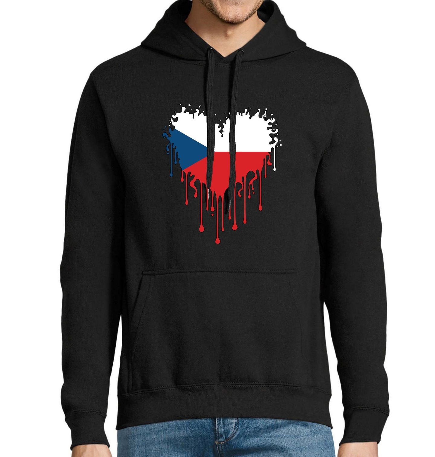 Pánská mikina Tající srdce Heart of Czechia. Umělecky rozteklé srdce ve tvaru české vlajky symbolizuje hlubokou a hrdou lásku k naší zemi. Srdce, vlajka, Česko, Česká republika, láska a vlastenectví na jednom motivu. Syté barvy trikolóry v kombinaci s moderním motivem vytváří originální kousek, který nosí emoce na rukávu – nebo spíš na hrudi.