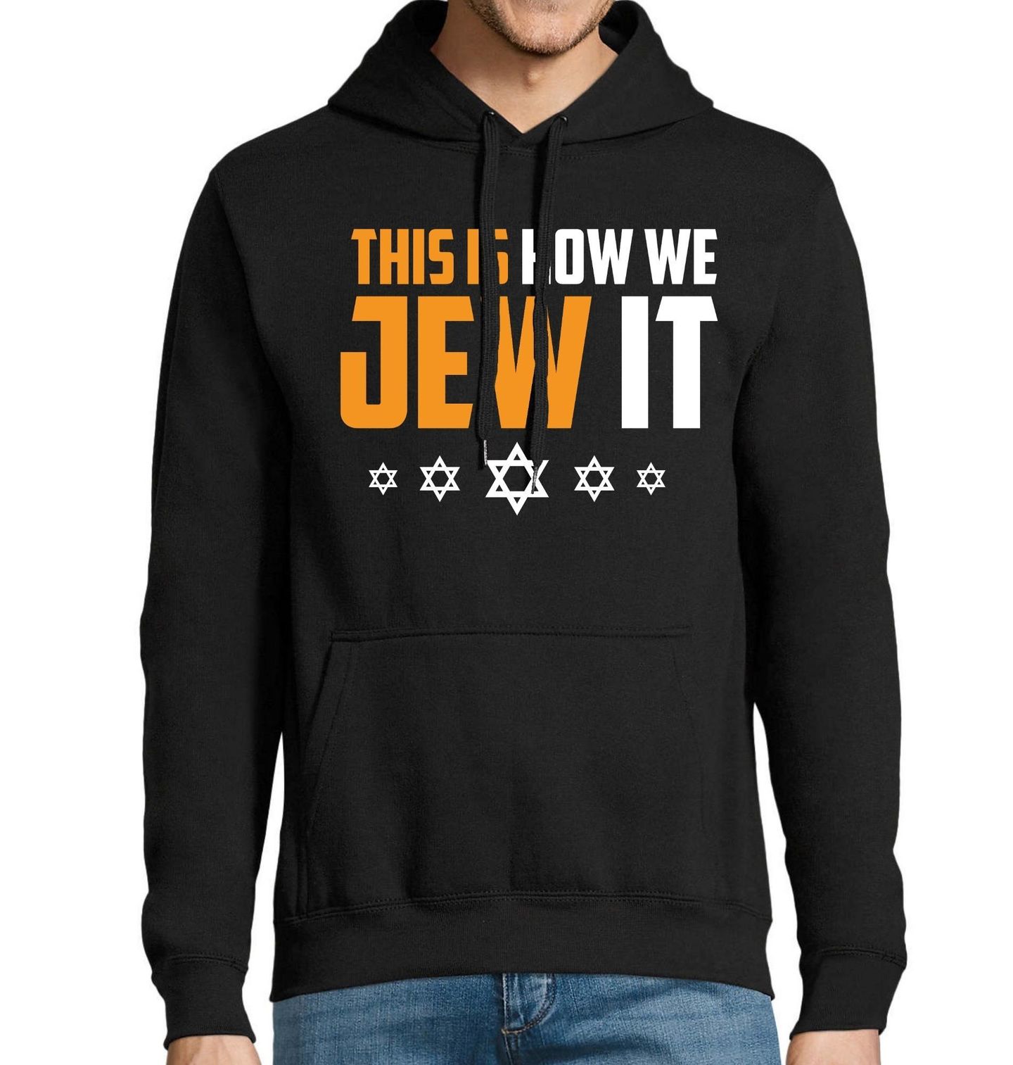 Pánská mikina Takhle to děláme po židovsku This is how we Jew it. Výrazný typografický motiv, který spojuje identitu, humor a tradici. Nápis doplněný o Davidovy hvězdy jasně odkazuje na judaismus a přináší moderní pohled na náboženství s lehkou nadsázkou. Tento design je ideální pro každého, kdo chce stylově vyjádřit svou příslušnost, hrdost i smysl pro humor.