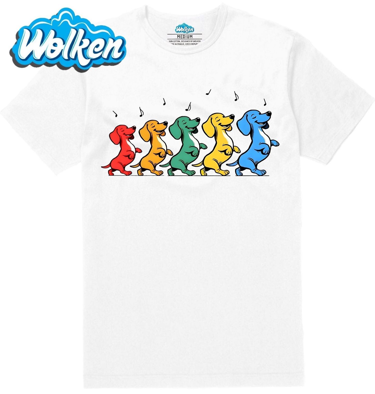 Pánské tričko Tančící Jezevčíci. Barevný motiv plný radosti, kde každý pes – tanečník je jiné barvy, ale všechno spojuje rytmus a pozitivní energie! Tento design zachycuje tančící psy plemene jezevčík, kteří vesele pochodují v duhovém průvodu. Perfektní dárek pro každého pejskaře, který miluje tanec.