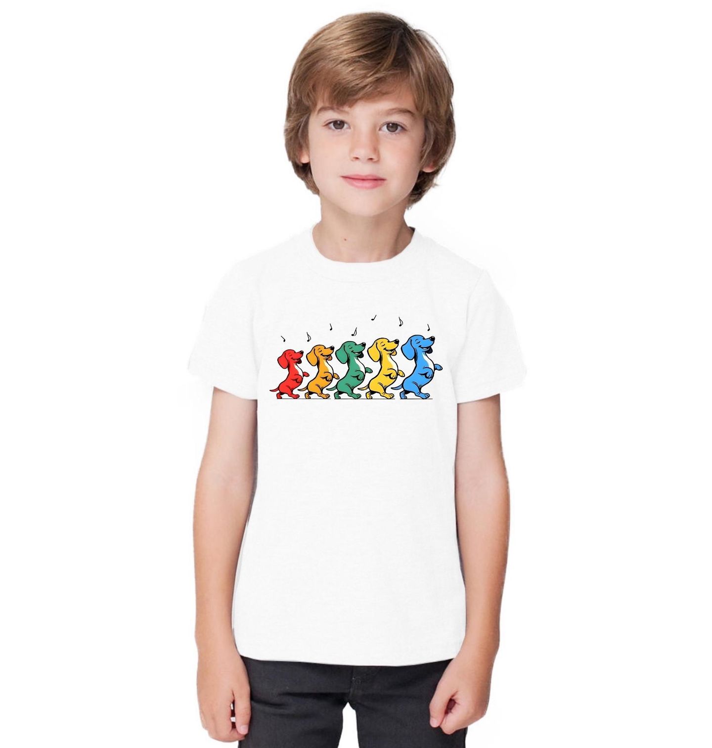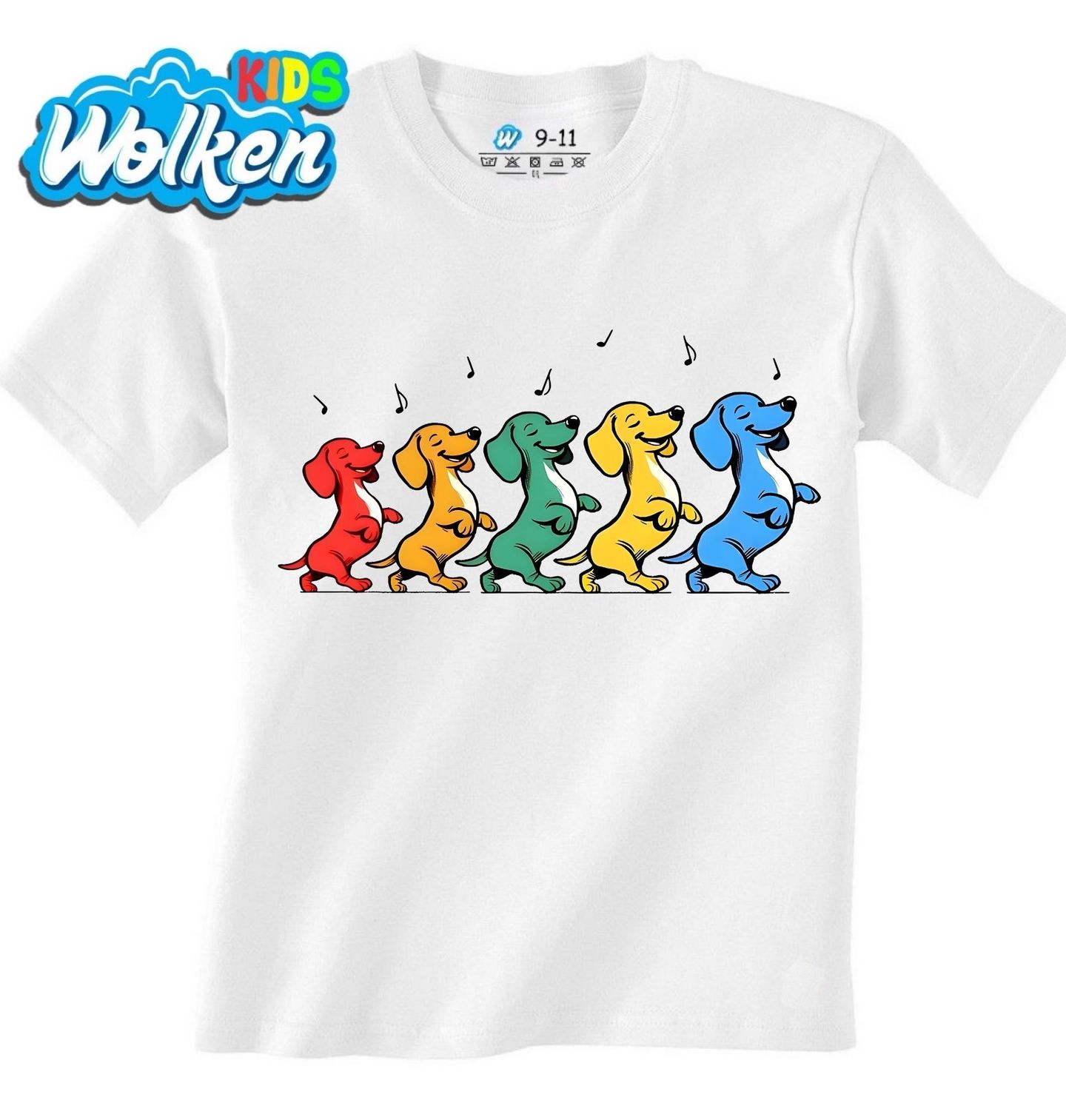 Dětské tričko Tančící Jezevčíci. Barevný motiv plný radosti, kde každý pes – tanečník je jiné barvy, ale všechno spojuje rytmus a pozitivní energie! Tento design zachycuje tančící psy plemene jezevčík, kteří vesele pochodují v duhovém průvodu. Perfektní dárek pro každého pejskaře, který miluje tanec.