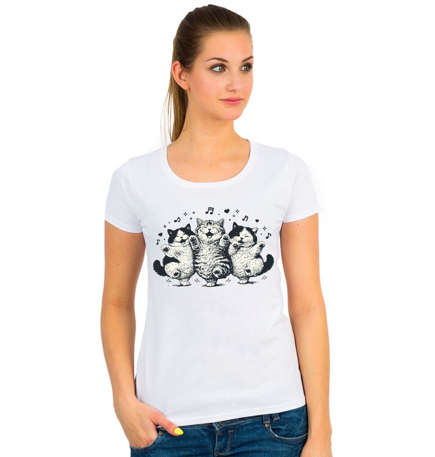 Dámské tričko Tancující Koťátka. Tento originální design vyzařuje pozitivní energii, lehkost a dobrou náladu, kterou si zamiluje každý milovník zvířat i hudby. Kočka v tomto provedení působí živě a zábavně, zatímco motiv zpěv a hudebních not dodává celému obrázku dynamiku a pohyb. Spojení hudby a roztomilosti vytváří jedinečný styl, který zaujme na první pohled.