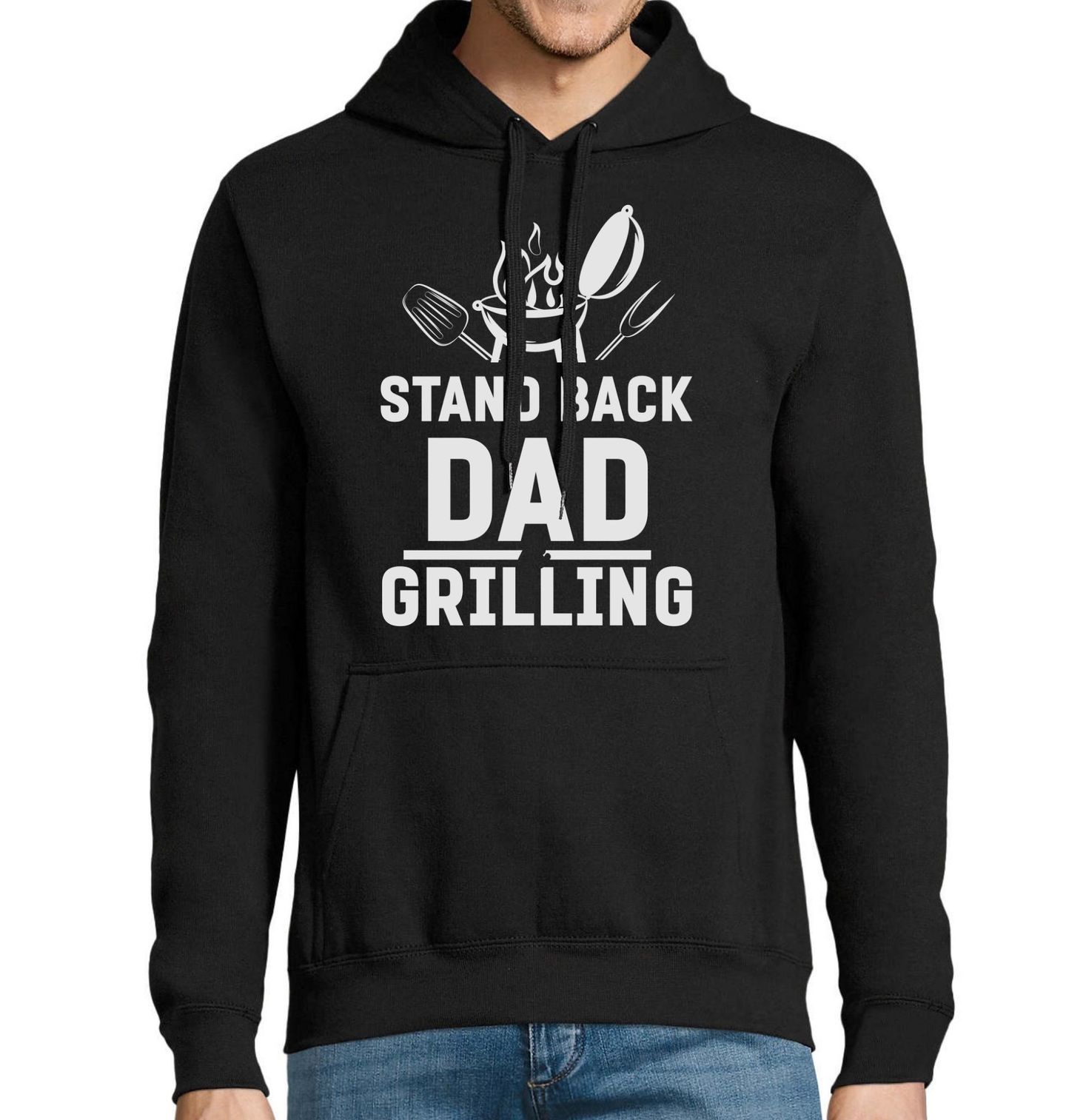 Pánská mikina Táta Král Grilování. Zábavný motiv pro všechny milovníky grilování. Design obsahuje text “STAND BACK DAD IS GRILLING” (v překladu „Ustupte, táta griluje“) doplněný ikonami grilu a náčiní. Perfektní pro každého tátu, který vládne u grilu a bere BBQ jako své království. Skvělý tip na dárek i stylový doplněk na letní sezónu.