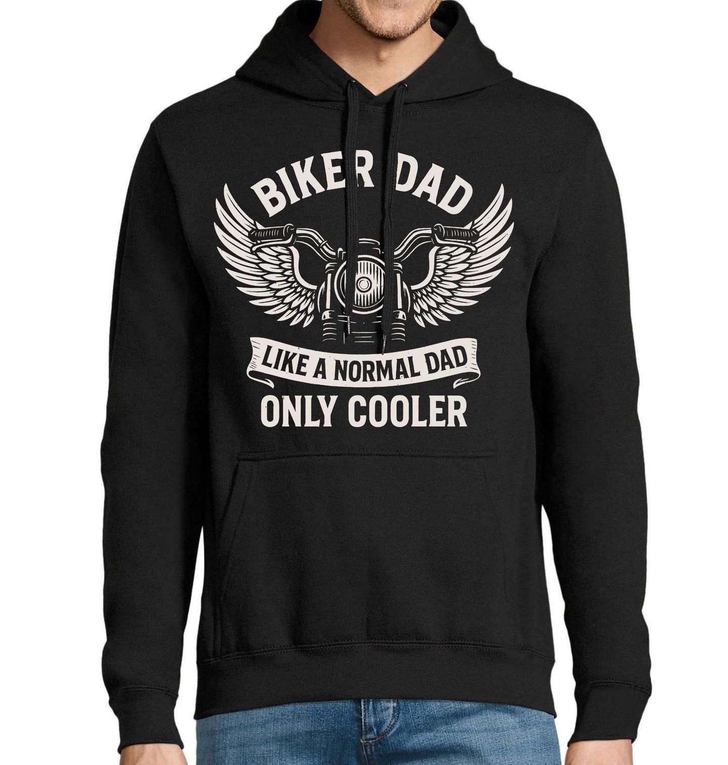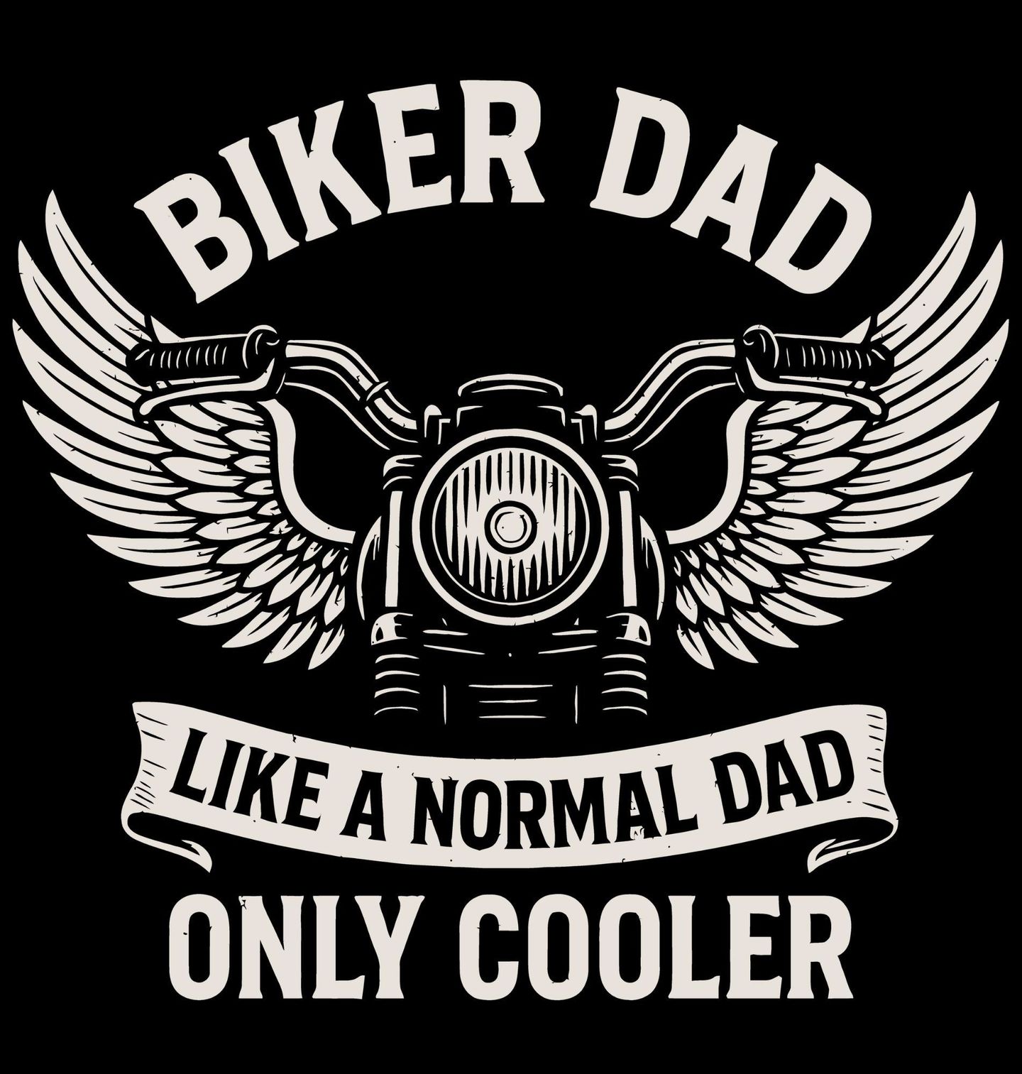 Pánská mikina Táta Motorkář Biker Dad. Stylový motiv pro každého, kdo miluje motorky a žije jako pravý motorkář. Kombinuje výraznou grafiku s křídly a silným poselstvím „Biker Dad – Like a Normal Dad Only Cooler“, což v překladu znamená „Motorkář táta – jako normální táta, jen víc cool.“ Tento design vystihuje svobodu, sílu i osobitý styl, který motorka přináší do života.