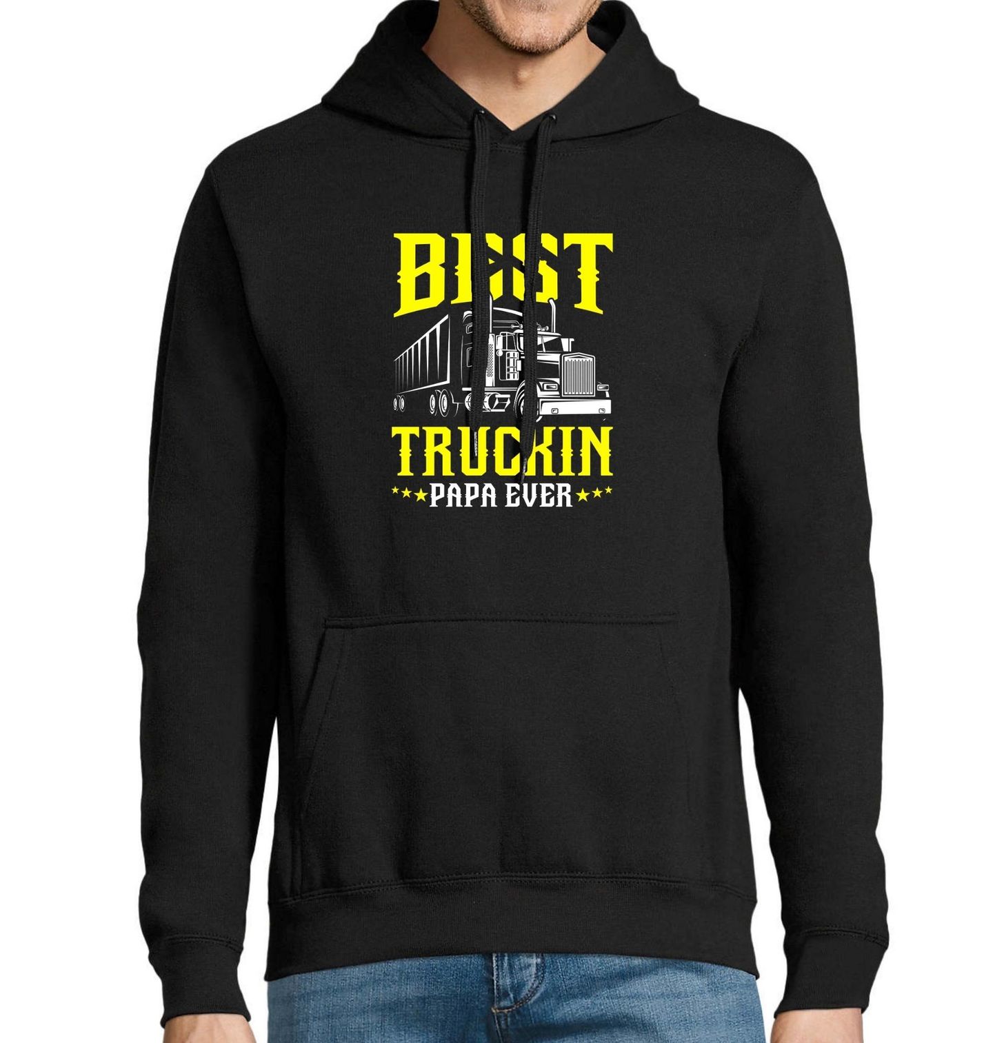 Pánská mikina Táta Nejlepší kamioňák na světě. Best Truckin’ Papa Ever = Nejlepší kamioňák táta vůbec (slovo „truckin’“ je lehká slovní hříčka, která zní jako „fucking’“, takže může být vtipně drsná. Tričko je pohodlné, odolné a ideální na dlouhé cesty pro každého hrdého řidiče.