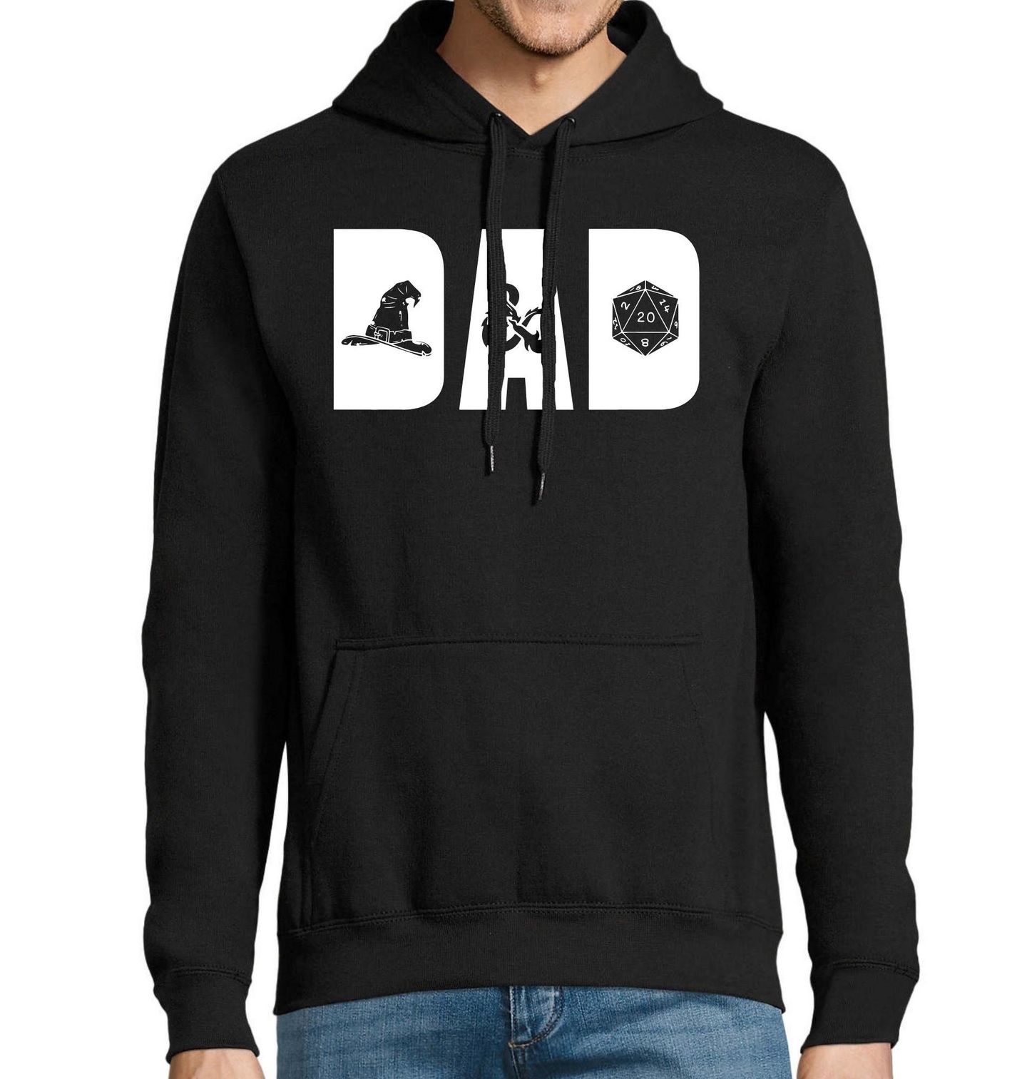Pánská mikina Táta s Fantasy Duší. Originální design „DAD“ doplněný o fantasy prvky – čarodějnický klobouk, draka a kostku D20. Slovo „dad“ znamená „táta“, a motiv tak spojuje rodičovství s vášní pro RPG hry. Ideální dárek pro každého herního nadšence.
