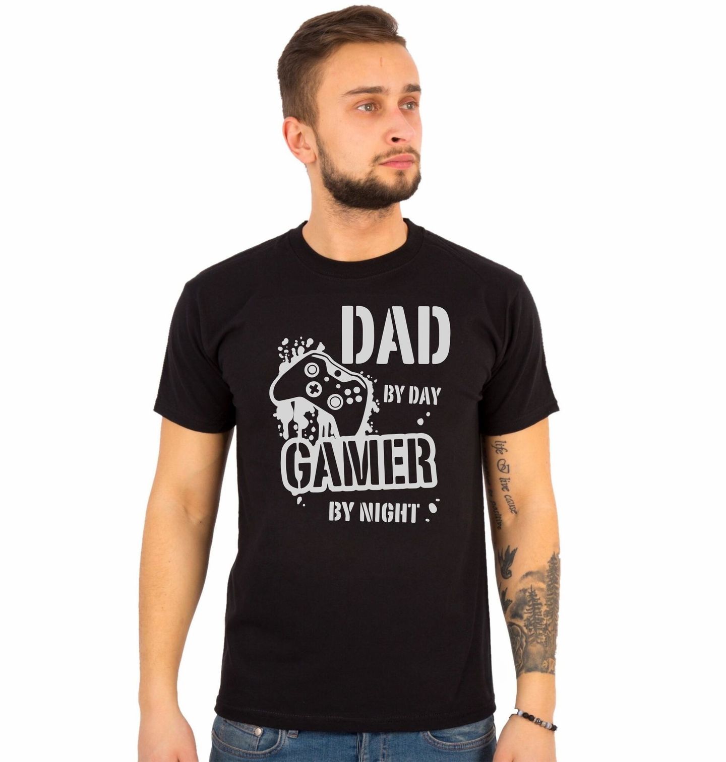 Pánské tričko Táta ve dne Hráč v noci. Zábavný design s textem „DAD BY DAY, GAMER BY NIGHT“, tedy „Táta ve dne, hráč v noci“. Perfektní design pro všechny tatínky, kteří milují videohry a zvládají kombinovat rodinu i zábavu.