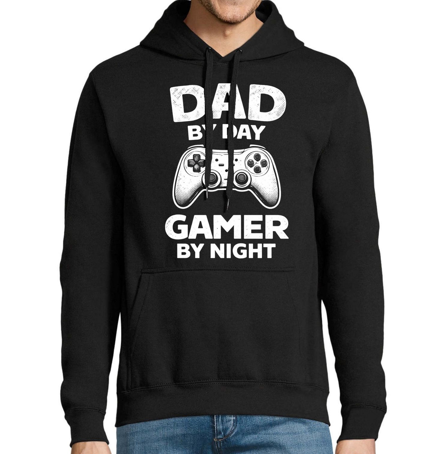 Pánská mikina Táta ve dne Hráč v noci Dad by Day Gamer by Night. Stylový a minimalistický design, který oslavuje dvojí identitu moderního otce. Obrázek v retrostylu zobrazuje detailní bílou ilustraci herního ovladače na černém podkladu. Text na obrázku zní: „DAD BY DAY GAMER BY NIGHT“, což do češtiny překládáme jako „Dnem táta, nocí hráč“.
