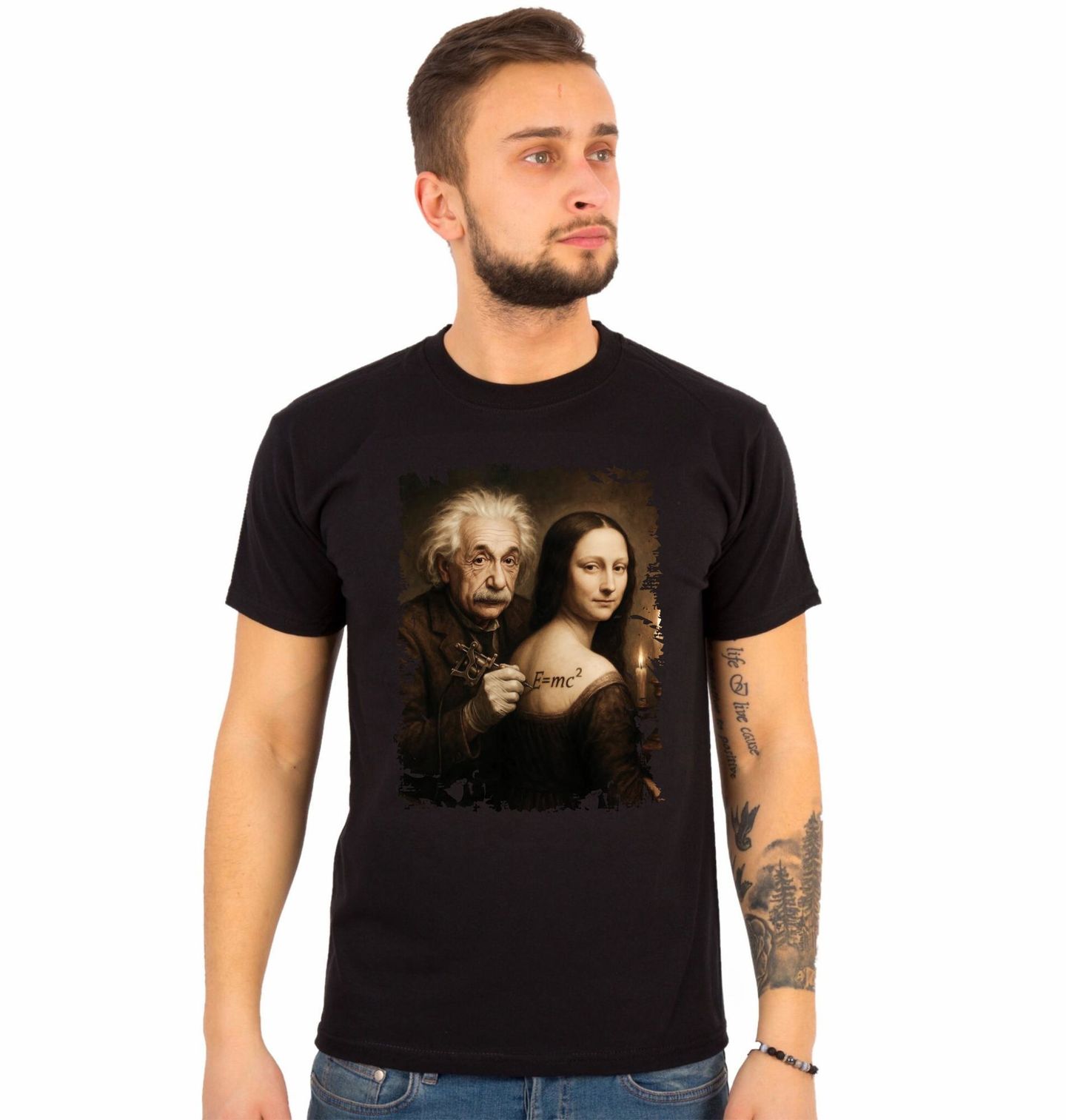 Pánské tričko Tatér Albert Einstein a Mona Lisa E=mc². Originální art motiv propojuje svět vědy a klasického malířství do jedinečné stylizované scény inspirované ikonami jako je Albert Einstein a Mona Lisa. Design působí jako renesanční obraz s moderním twistem, kde vzniká výrazné tetování s motivem slavného vzorce a dodává celému vizuálu provokativní i humorný nádech.